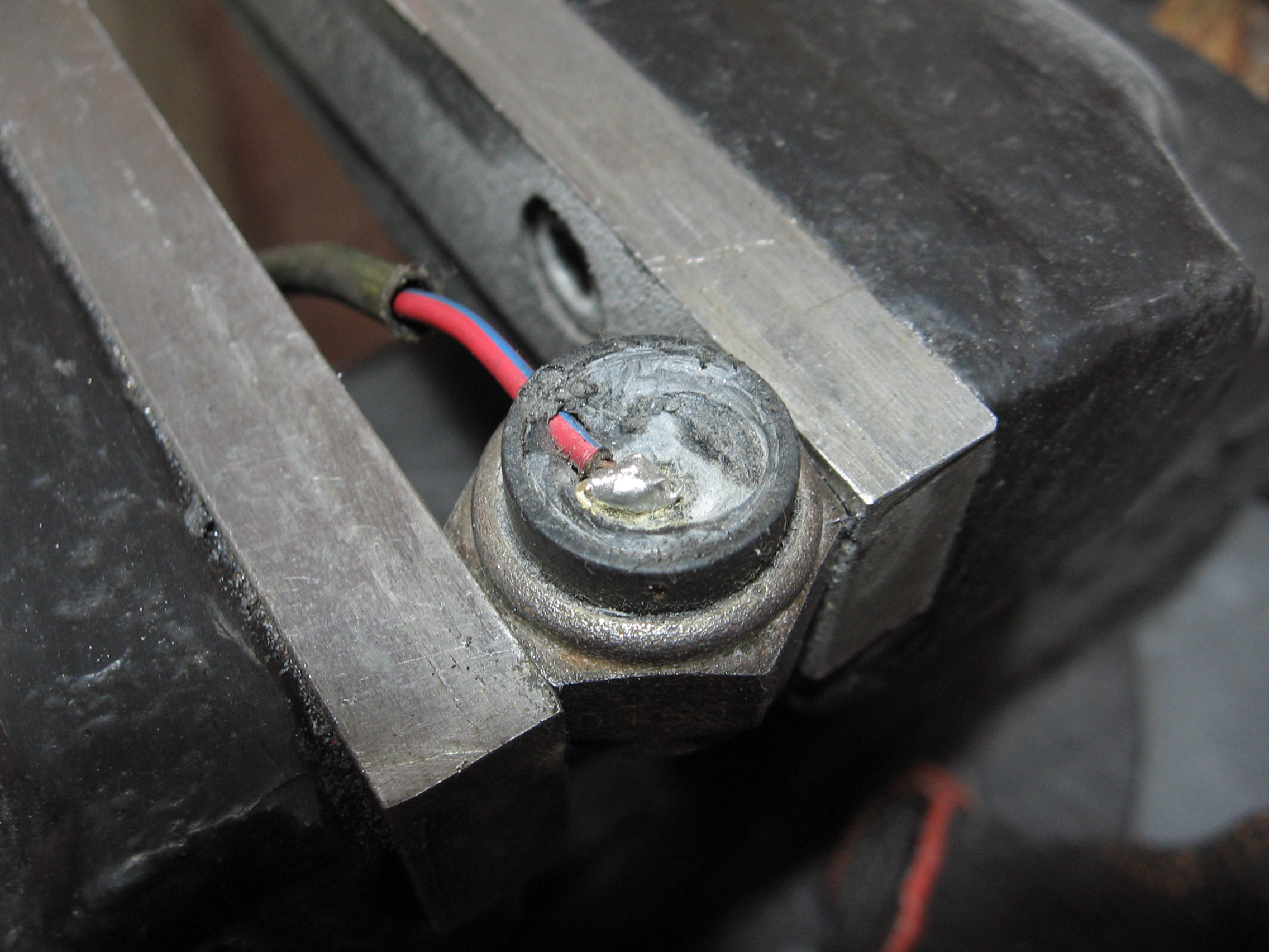 Дремелевская алмазная насадочка, дрель, пять минут работы и контакт найден и очищен. Припаиваем к нему провод… и заливаем сверху термоклеем. Можно было и полиэфирной смолой залить, но в час ночи ждать в гараже, пока она полимеризуется, нет никакого желания. Сойдёт и говноклей. Нет там таких температур, от которых он "поплывёт". А если и поплывёт, то и чёрт с ним, всё равно пропаянный контакт останется им закрыт.