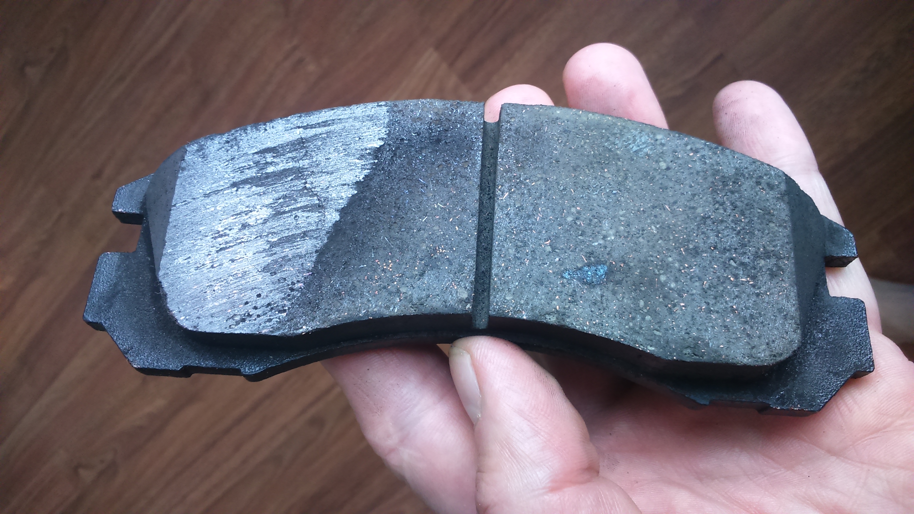 Вчера поменял передние колодки. Проехал км 5, чувствую машина не катится, как на ручнике. Левый диск разгорелся капитально, пришлось разбирать и результат на фото. Колодка эта внутренняя. Суппорт и скоба визуально в норме. В чем м.б. причина такого износа? В поиске ничего нет.