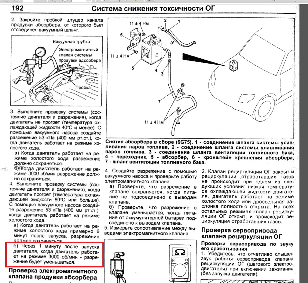 Прогрел двигатель. Скинул шланг, что идет от абсорбера к клапану. Сам клапан из коллектора не вынимал. И ровно через 1 минуту, клапан затарахтел, на выходе появилось разряжение. Только смущает, что это произошло при простое и оборотах ХХ. А не ни накаких 3.000 об/мин. Для других моделей указано, спустя 3 минуты сработает.