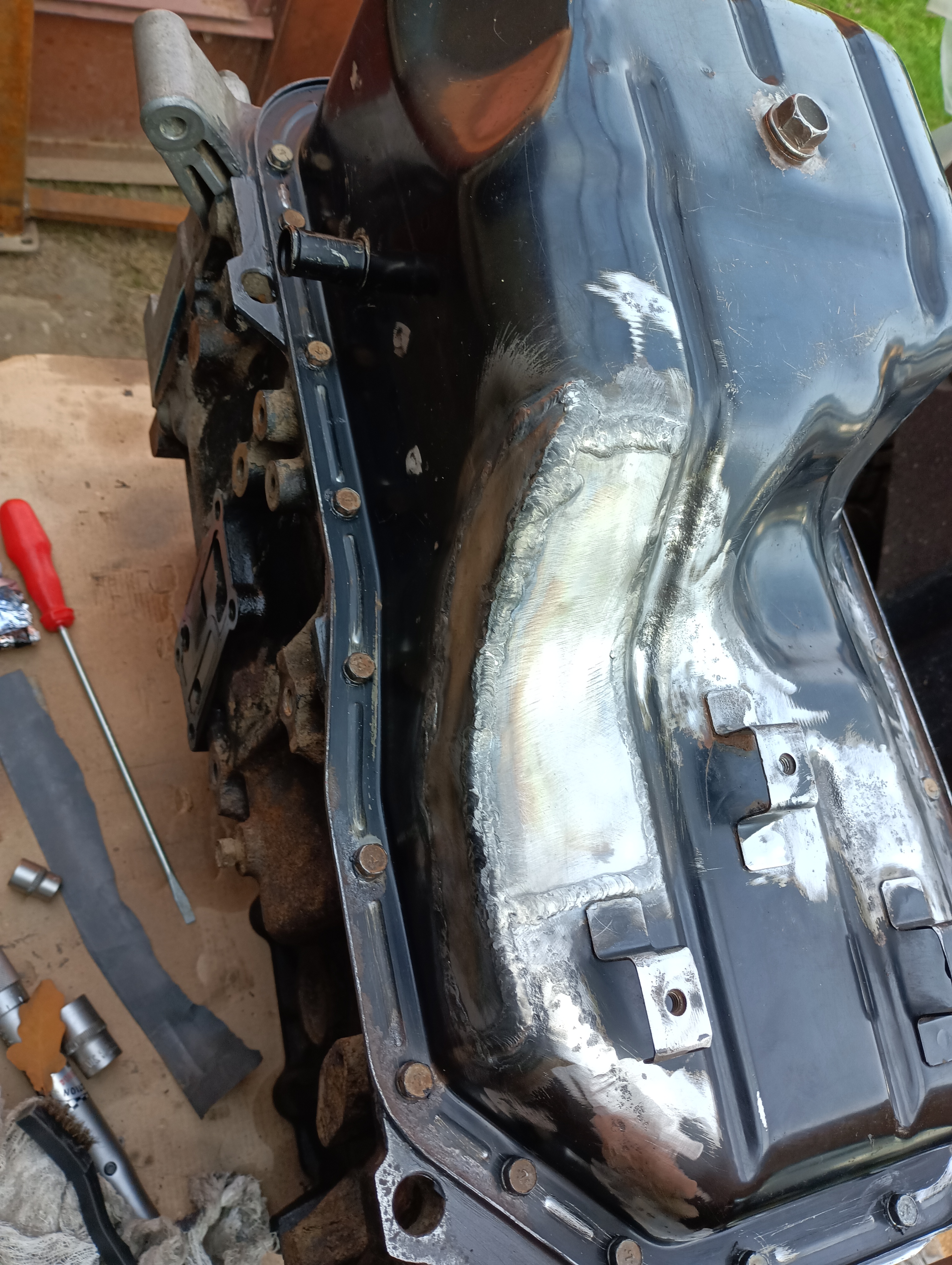 В этот раз мотор вынимал полностью по более глобальной причине , заодно и поддон проварили Тиг сваркой с хорошим прогревом . Хорошая заплата.