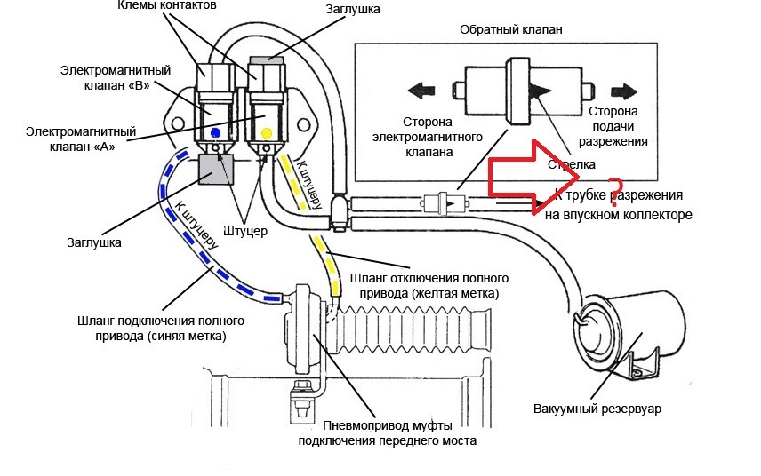 Когда вакуум отсутствует, муфта передней оси замыкается и машина становится полноприводной. Сделано специально, чтобы не остаться на одной оси в сложных дорожных условиях.
