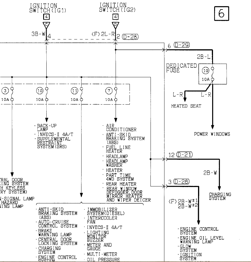 Если что вот твоя схема по плюсу - от IG1 питается через 11-й предохранитель приборка и ЭБУ (чем можно обосновать незапуск), от IG2 - кондиционер и прочее. Схема правда только 2001-го года, но вряд ли что-то сильно поменялось.