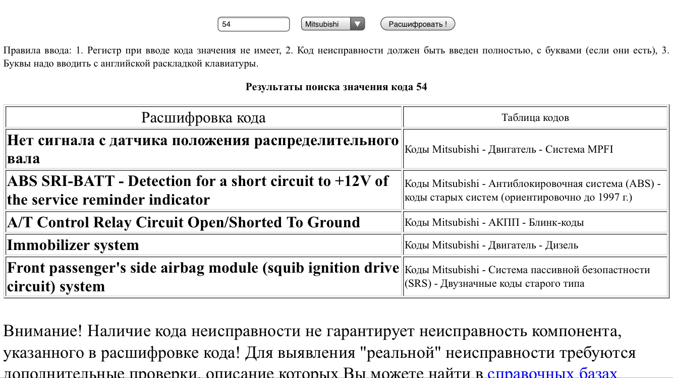 Ввела на этом сайте ошибку, там пишет про температуру что то. Может все таки перегрев акпп?SmoAG писал(а):Вот не знаю что у вас за мануал, но у вас используется протокол митцу, номер ошибки будет совпадать на всех машинах где стоит данный протокол.Екатерина1986 писал(а):В мануале 54 ошибка звучит как неправильное передаточное отношение четвёртой передачи(((