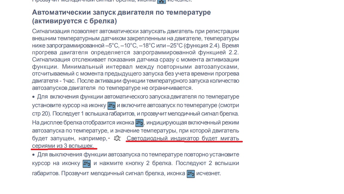 Все эти мигания и звуки сигналки происходят при активации функции автозапуска. Но потом, при отключенном двигателе, закрытых дверях светодиод мигает так, как будто авто стоит под охраной сигналки. Двигатель заводишь, мигание пропадает. Не должен он мигать при этом.