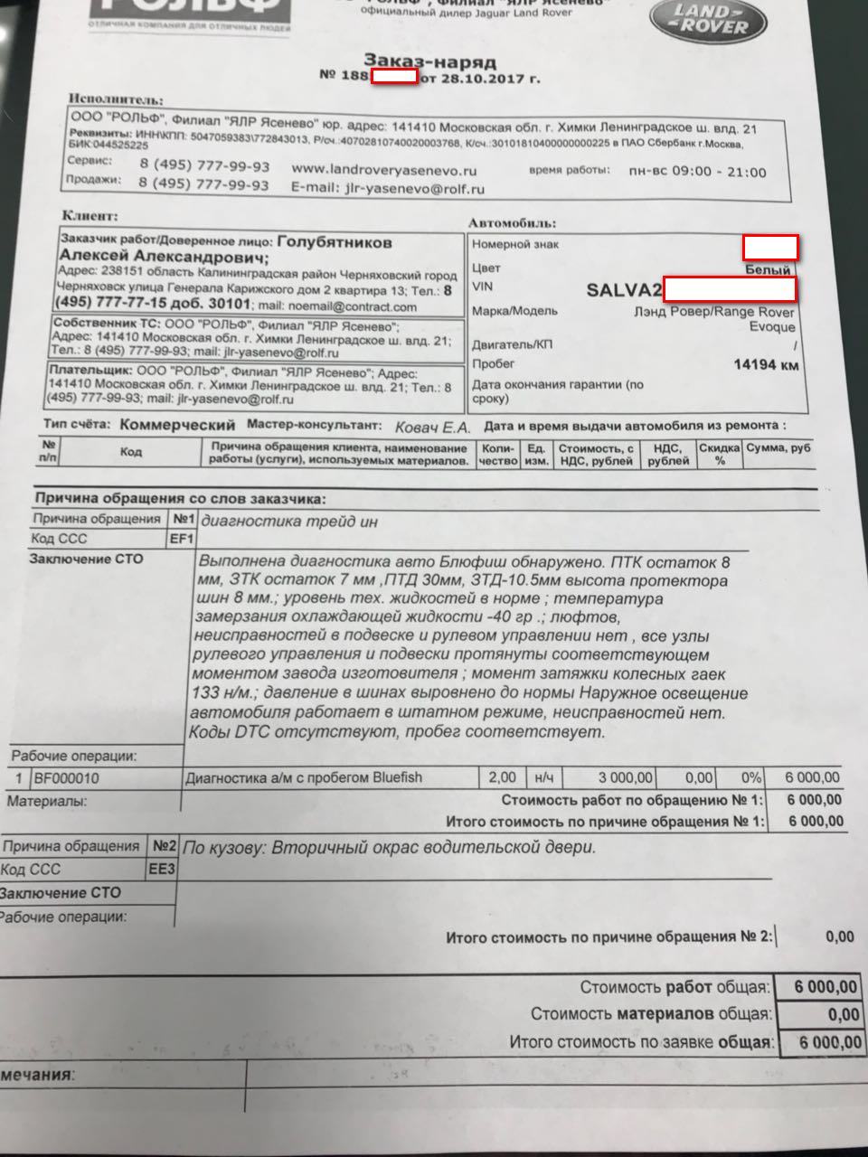 Из выявленных проблем – перекрас водительской двери, подтвержденный нарядом заказом официального дилера, который производил ремонтные работы. (В наряде-заказе указано матирование и перекрас, без рихтовки, вытяжки и прочих сложных кузовных работ)