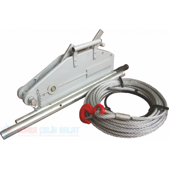 В комплекте со стальным канатом длиной 20м и двумя запасными предохранительными болтами.
