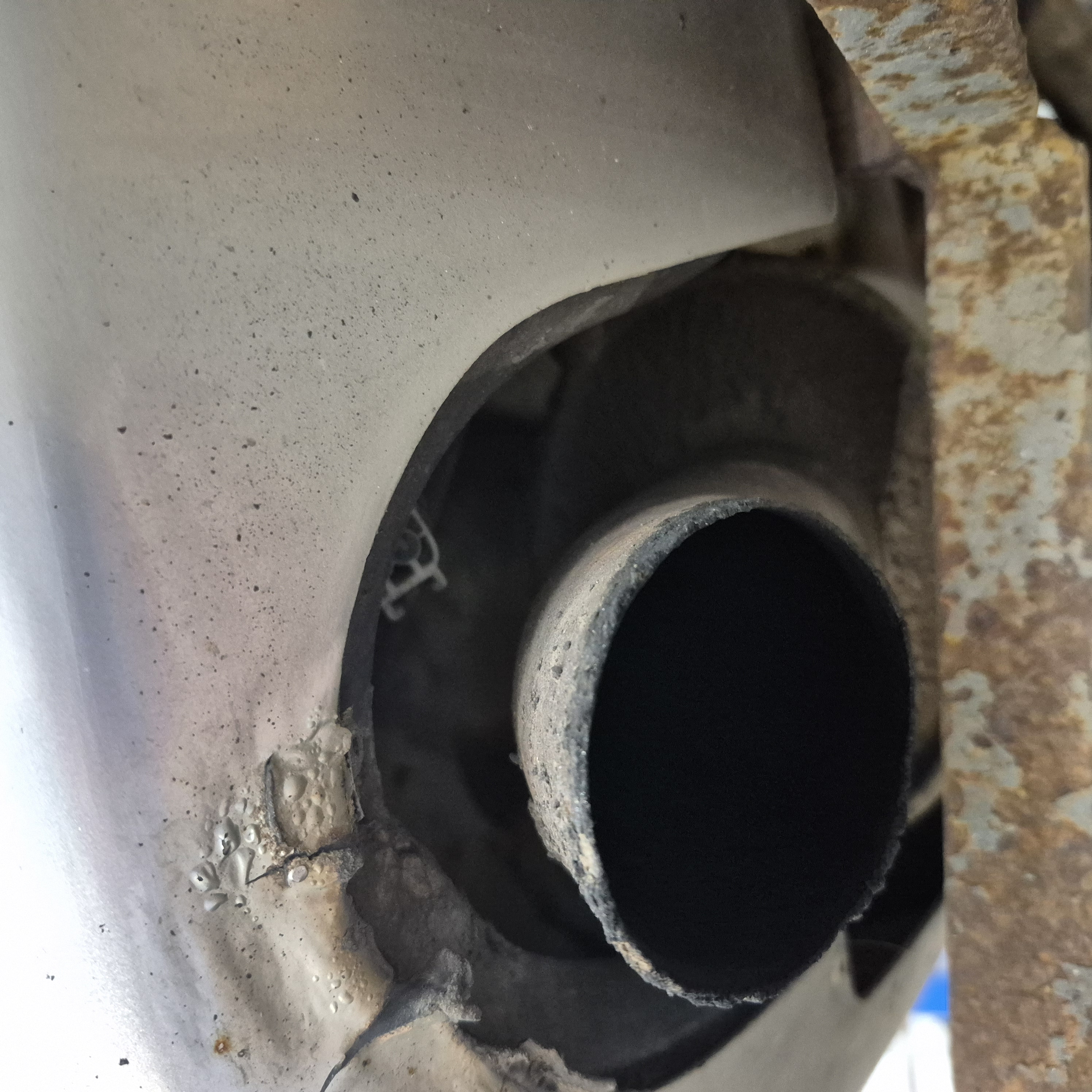 Сзади также стояла защита бампера металлическая, она закрывала это место, видимо поэтому и не заметил, но отверстие в выхлопной ниже ее и вниз идет, т.е. не мешала она выхлопным газам выходить.