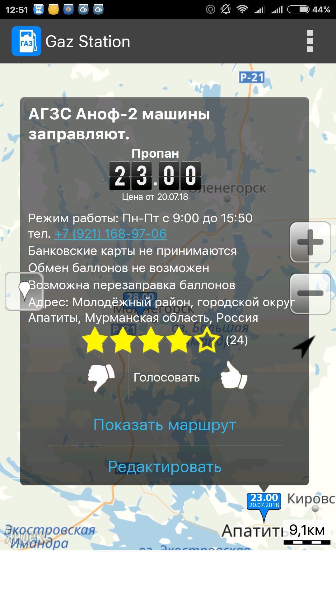 Оно, безусловно, лучшее, но увы. Знает много давно закрытых заправок и не знает новых. Чётко работает только в центральной части России.