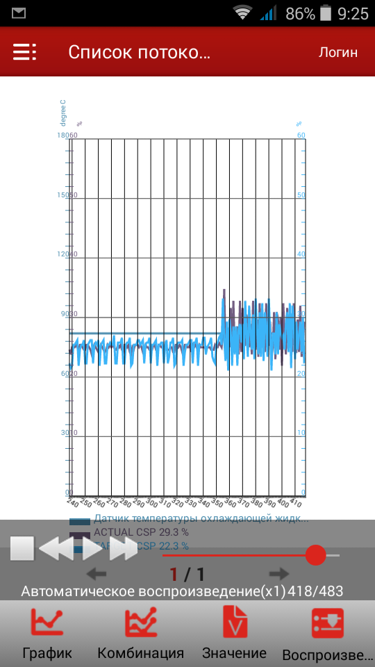 На 350-й секунде на двигатель возрастает нагрузка, автомат переводится в Драйв. Графики CSP перестают совпадать, амплитуда сигнала достигает 10-12%, двигатель сильно трясет, он может заглохнуть.