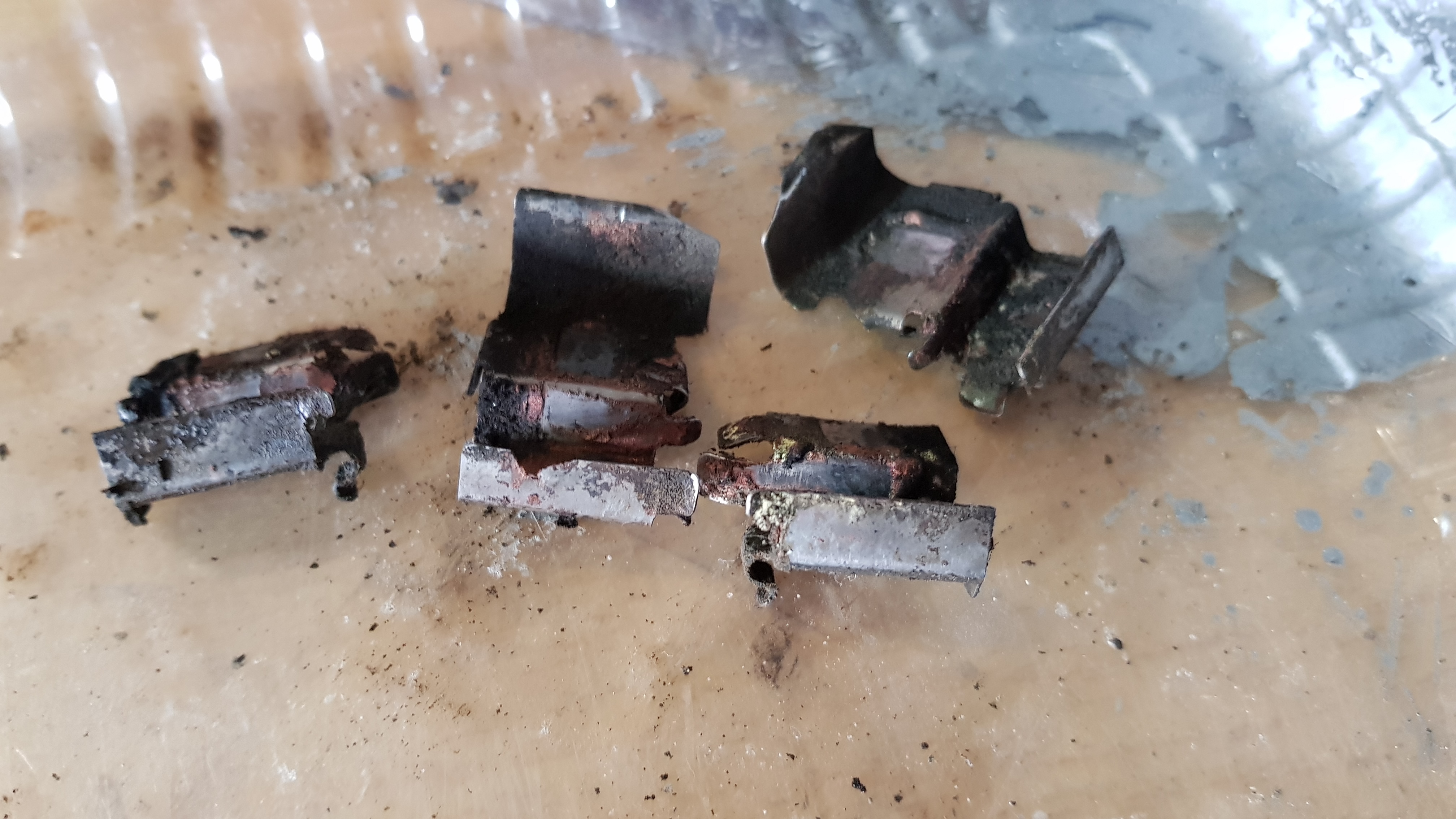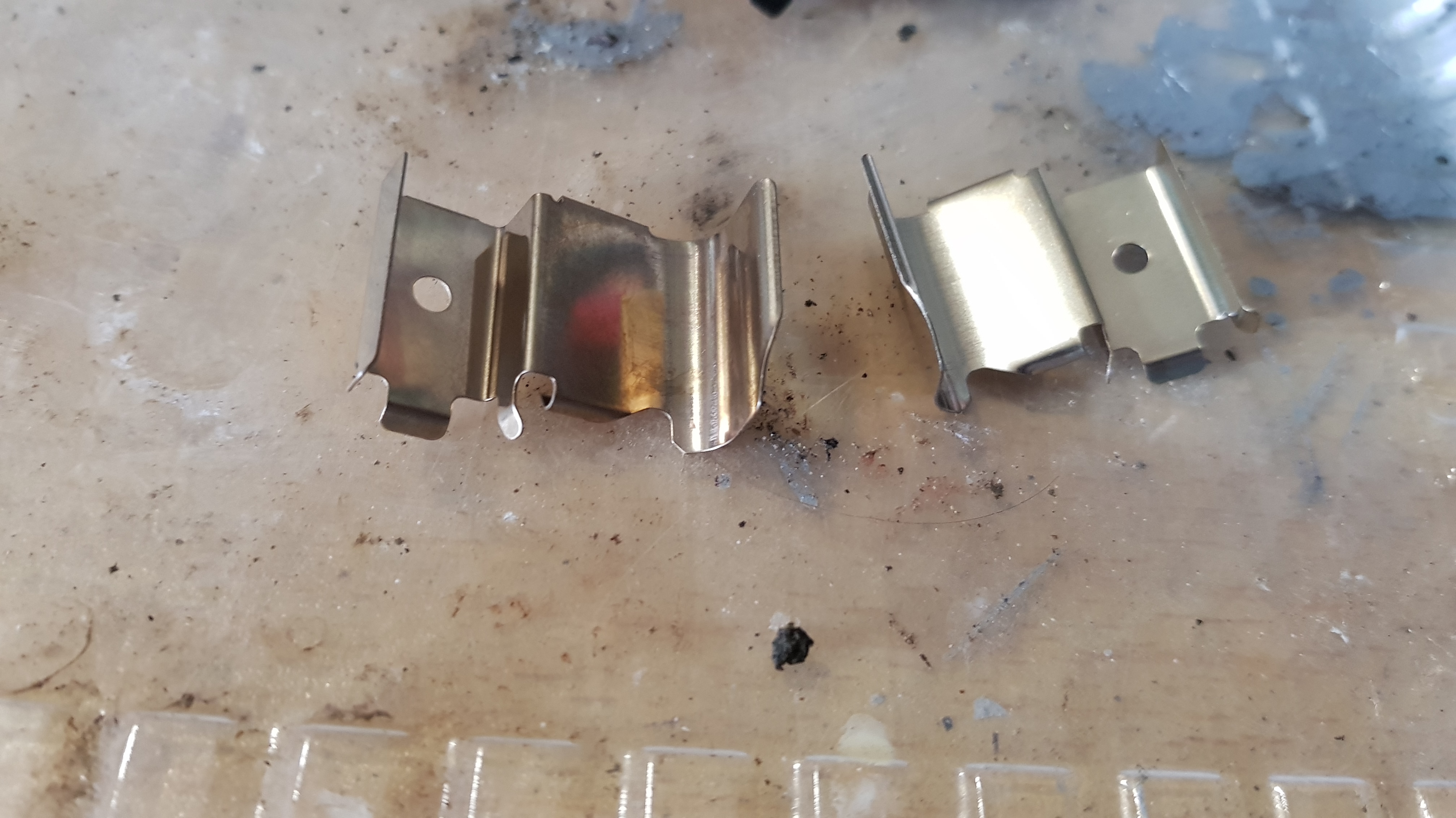 Старые вкладыши ассиметричные...вертикальный пружинный усик и фигурный паз только на нижнем вкладыше, на верхнем только фигурный паз. Новые одинаковые для верха и низа суппорта...и пружиннвми усиками прижимают колодки к стенкам пазов: