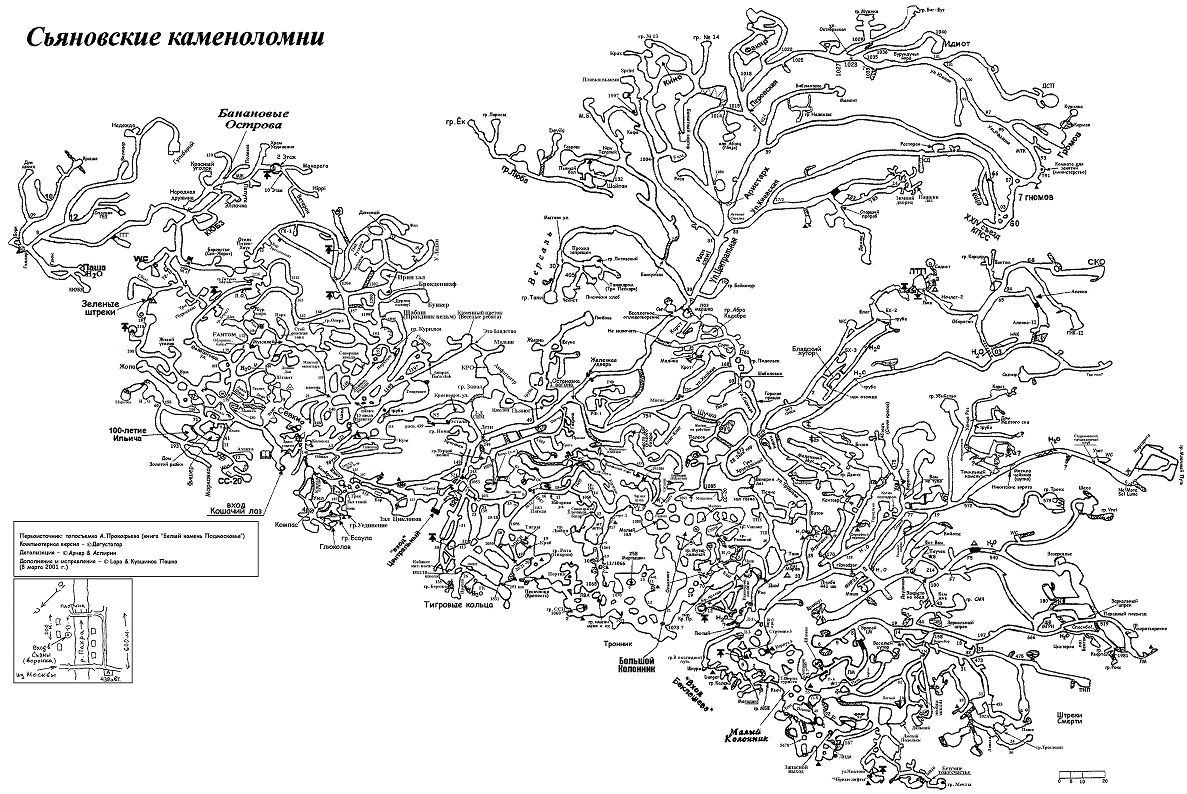 В субботу, 6 октября, собираемся посетить Сьяновские каменоломни. Это подмосковная система пещер-каменоломен из группы так называемых Новленских пещер. Она является одной из крупнейших известных старинных систем на территории России, самая крупная в Московской области и 5-я по величине в стране. Общая протяжённость порядка 19 км., температура в Сьянах около 8 градусов круглый год, влажность 80 процентов. Всё это дело находится в районе деревни Старосъяново , в 15км от МКАДа по каширскому шоссе. Так что у нас есть прекрасная возможность спустится в пещеры, заблудиться, дождаться помощи и быть спасёнными. В следствии чего, устроить маленький праздник, с мангалами, костром, горячим чаем и разными закусонами. Участие могут принять все желающие, подготовка автомобиля роли не играет, стандартные авто приветствуются.