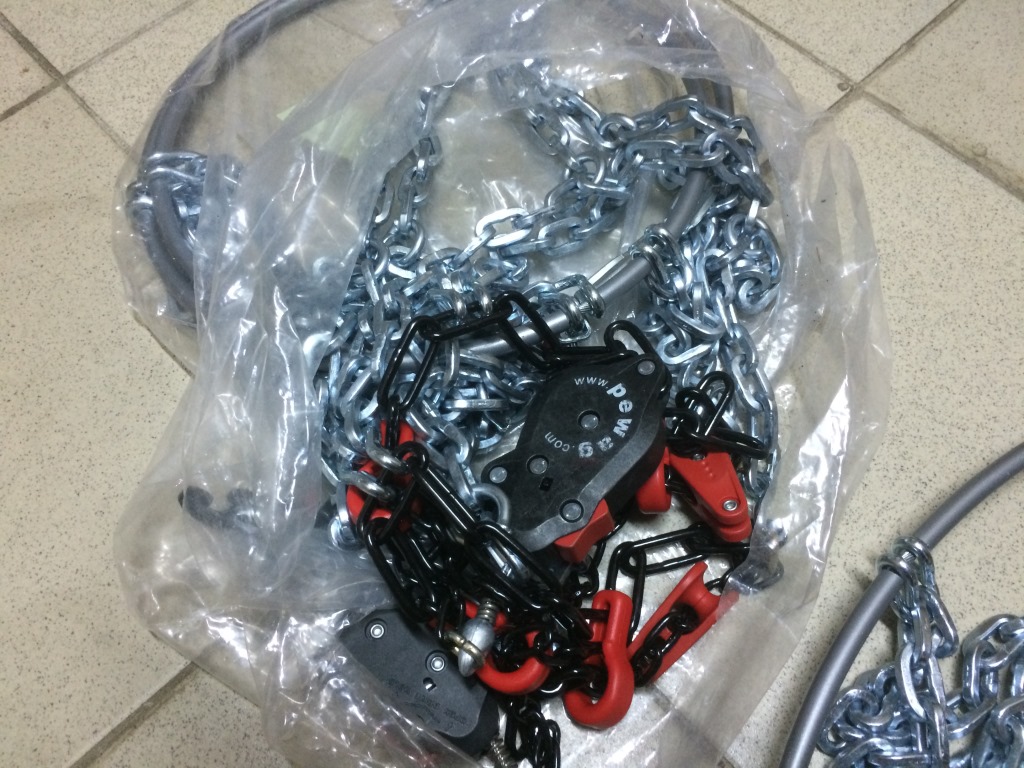 В комплект поставки входят: 1 пара цепей, детали для ремонта и рюкзак для переноски и хранения цепей."