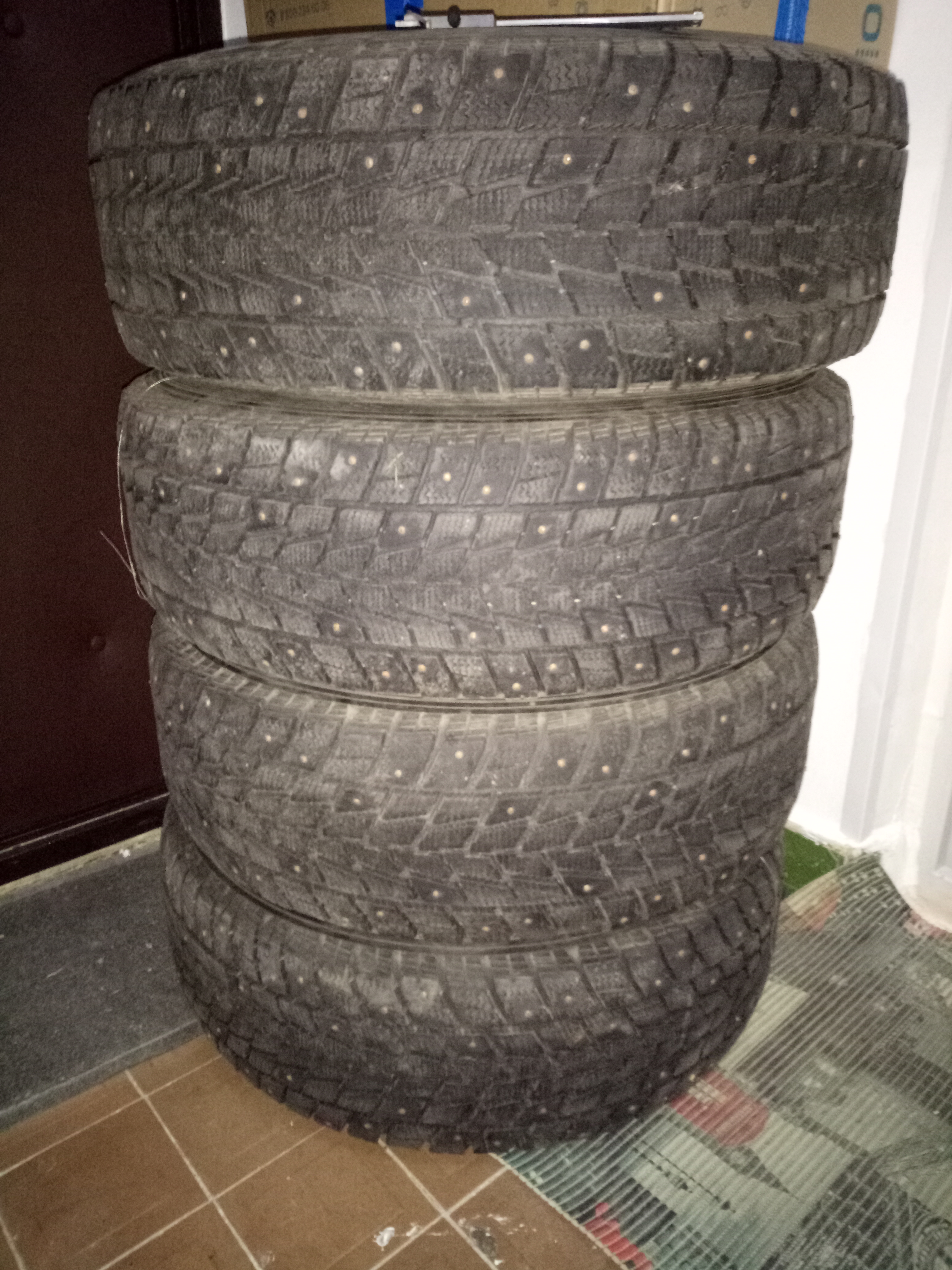 Комплект резины 4 шт. Без грыж и порезов. Шипы почти все на месте, протектор 8-9мм износ равномерный. Продам за символические 5 тыр. без торга, ибо занимают много места.