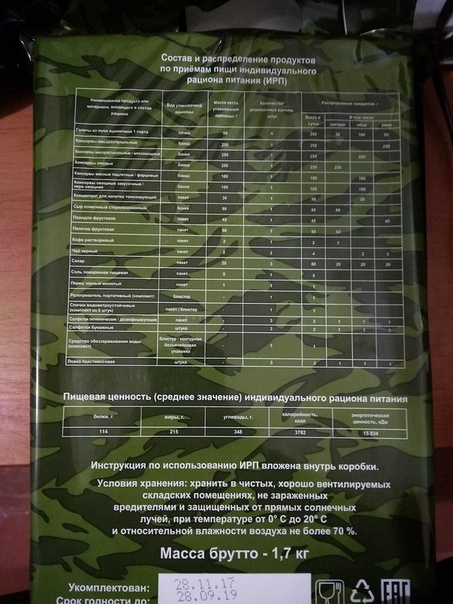 Консервы входящие в комплект ИРП имеют срок годности +1 год к сроку годности на упаковке.