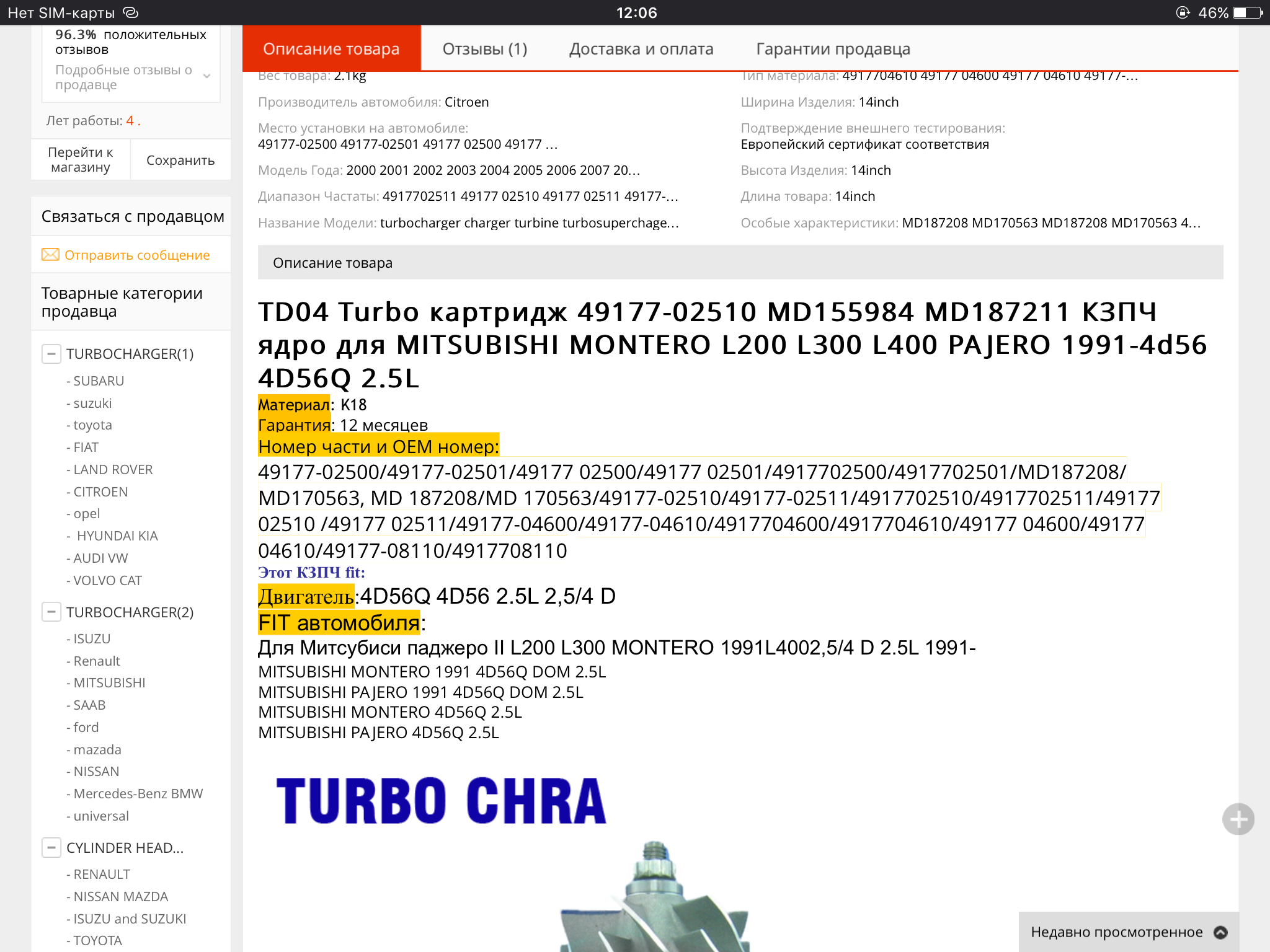 Продам картридж турбины TD04. Пришел из Китая. Причина продажи: поставщик ошибся с моделью, не хочу связываться с возвратом. Покупал за 7300 с доставкой, отдаю за 5500. Номер детали и поддерживаемые модели - на фото. Настоятельно рекомендую перед звонком замерить крыльчатки Вашей турбины. +7(985) 210-55-17, Москва.