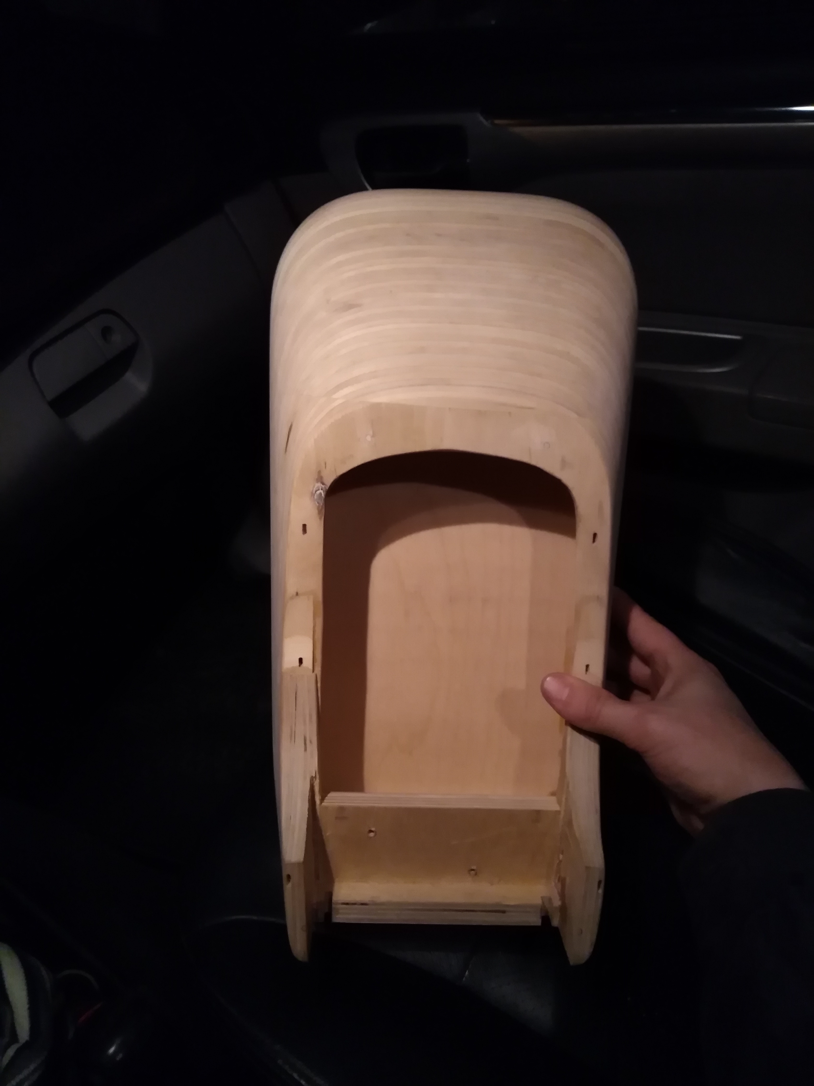 Родной подлокотник в паджеро спорте для меня слишком низкий и короткий, его все равно что нет. Занялся изготовлением подлокотника под себя. Сначала заготовка из фанеры, после обработки выглядит вот так: