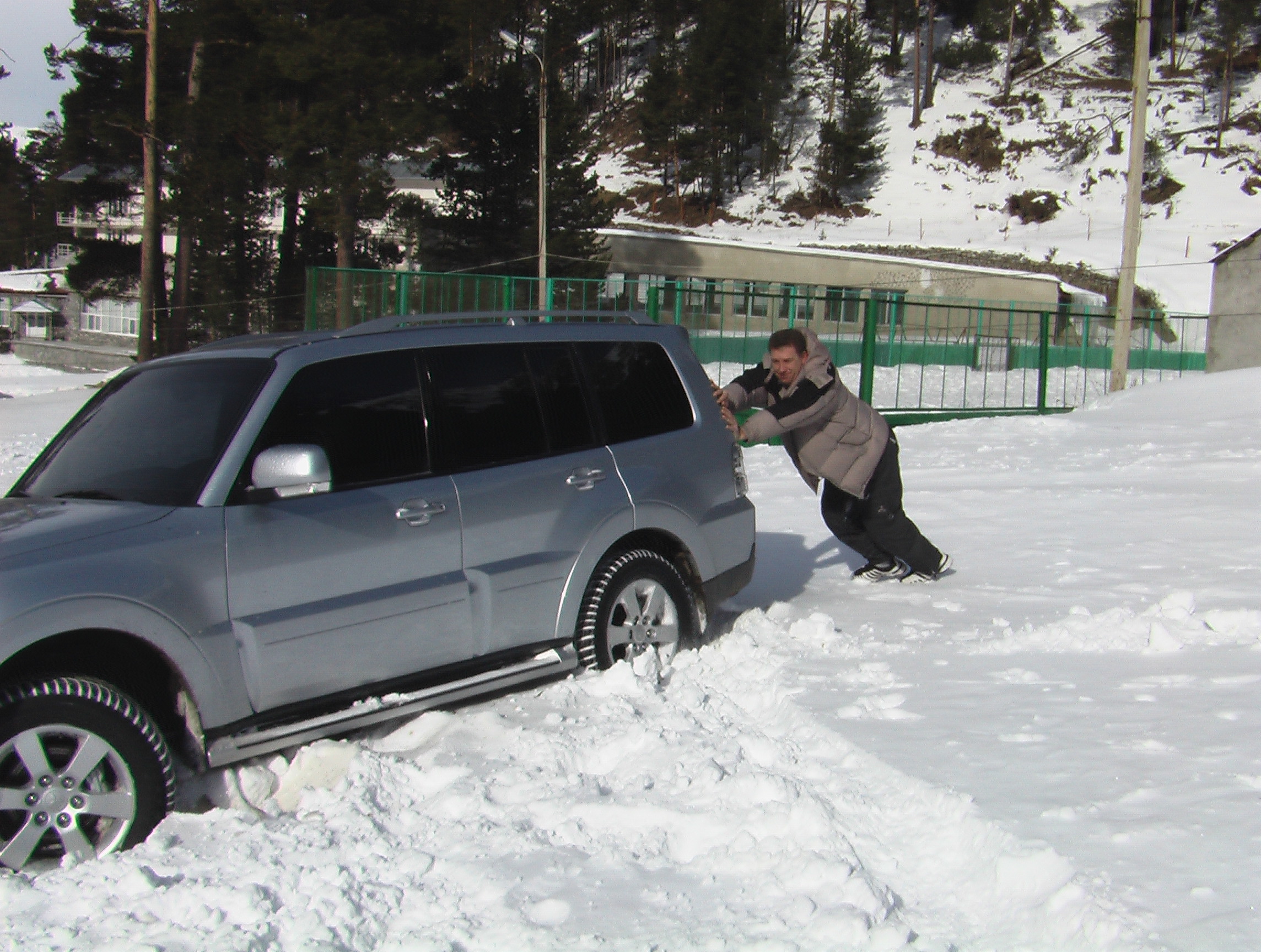 Сергей газовал, а я, возомнив себя Гераклом, попытался вытолкнуть авто из снежного плена, но где я, а где 3 тонны?!