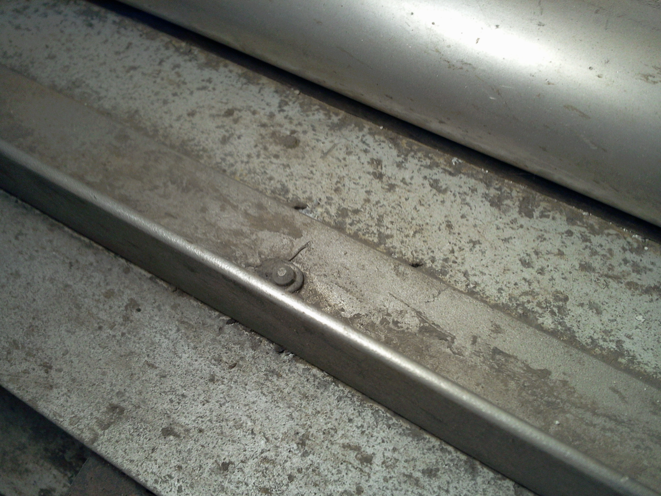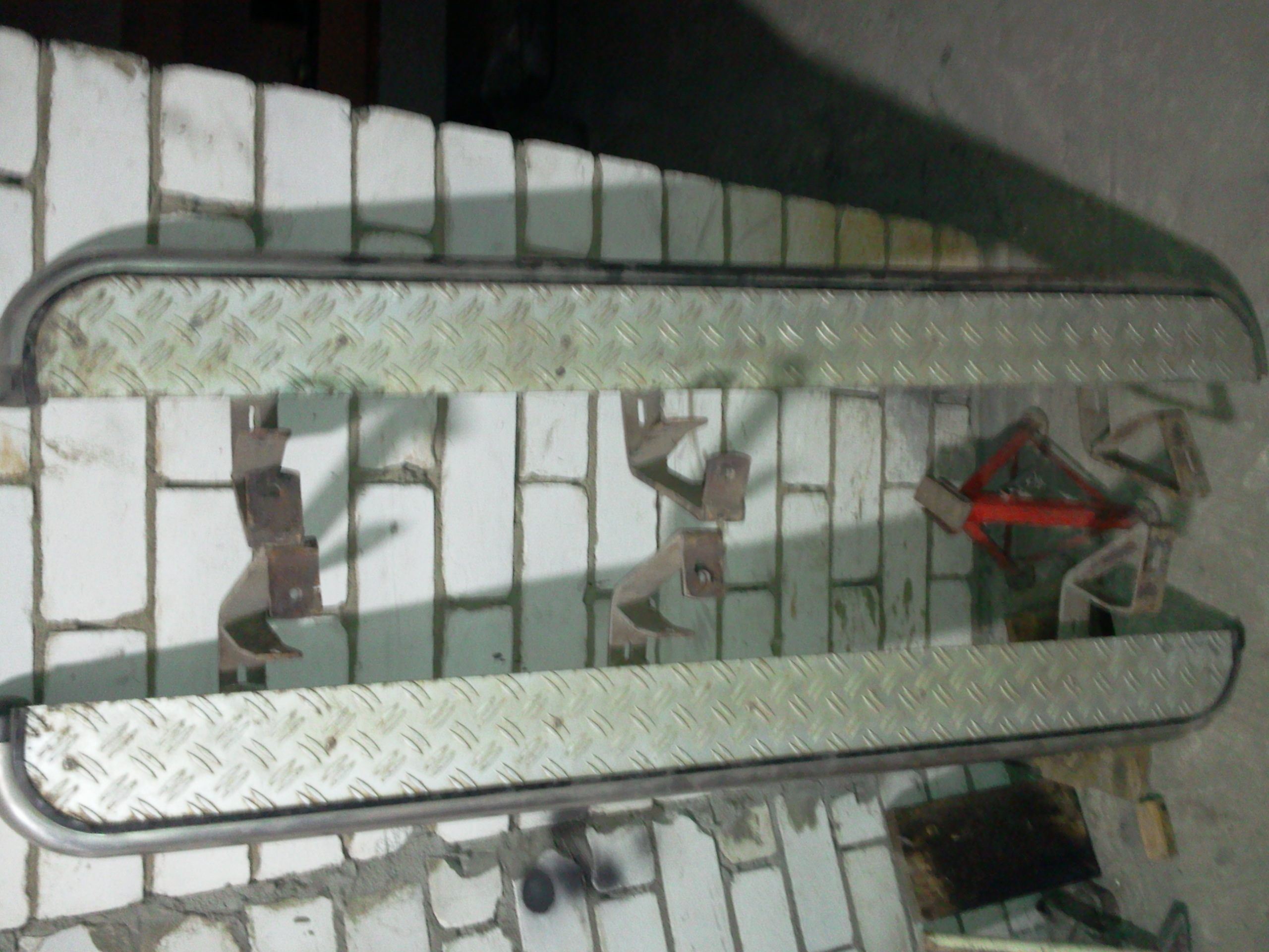 Диаметр трубы - забыл измерить. Где-то не менее 40 мм. Длина подножек - 142 см, ширина - 14 см. Толщина стенки трубы - 2 мм. Усиливающий снизу подножку уголок из нержавейки - 32-ой (ширина полки - 32 мм), толщина его - 3,5 мм. Пластины, к которым прикручены крепежи - из нержавейки толщиной 7 мм и шириной 40 мм. Рифленка - алюминий. Остальное - на фото.
