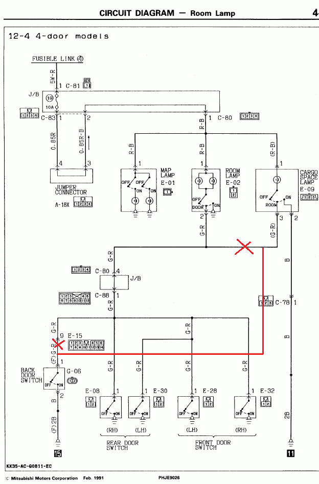 Находим на разъёме провод зелёный с красной полосой на части косы, идущей из двери (вывод 9), и кусаем.