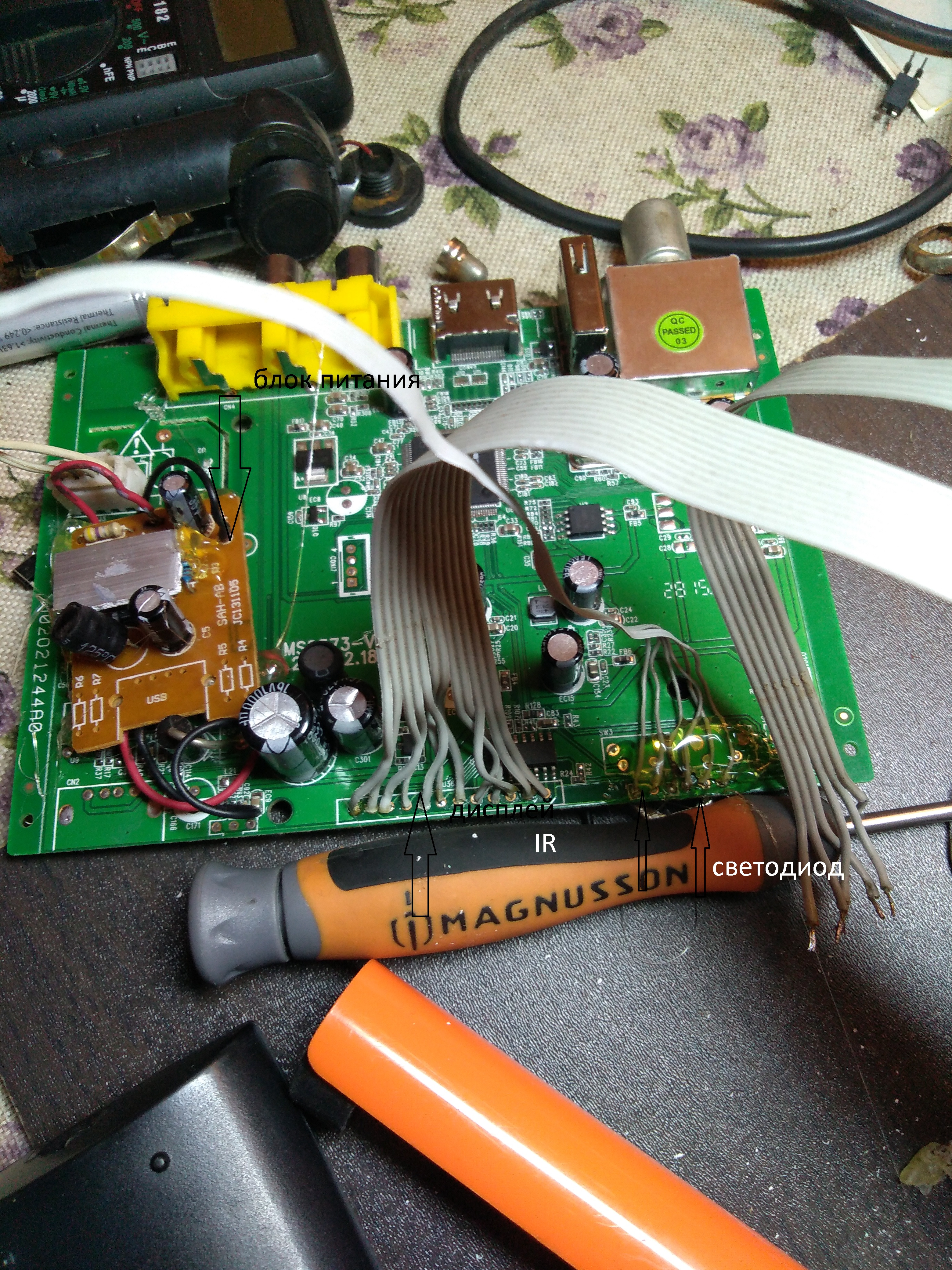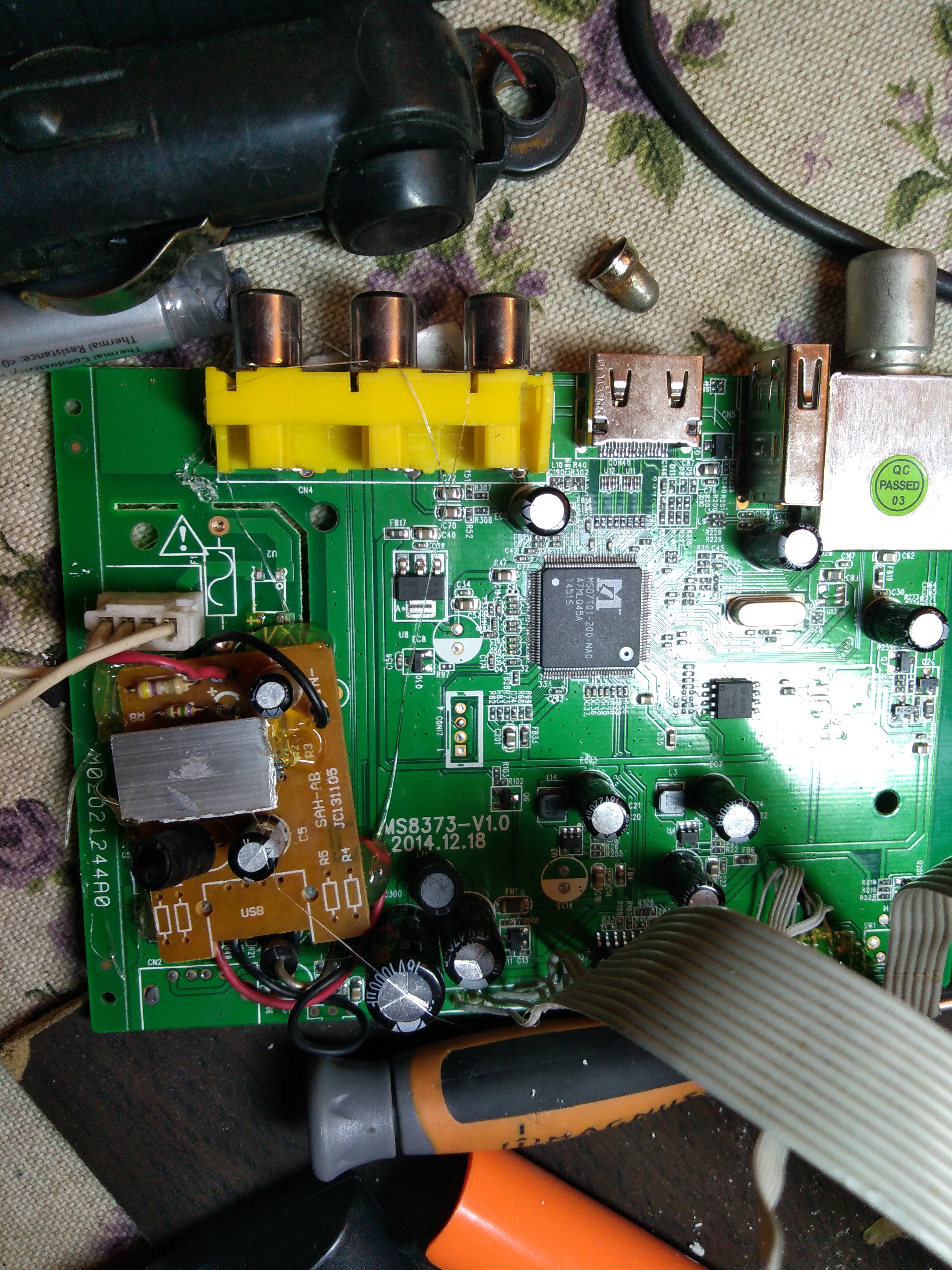 Нашел старенький тюнер DVB-T2 ,удалил блок питания 220В с него ,предварительно замерив выходное напряжение ,ктр составило 5В, взял зарядник тлф с прикуривателя с вых. напряжением 5В, 0.5 А.,внедрил в плату.