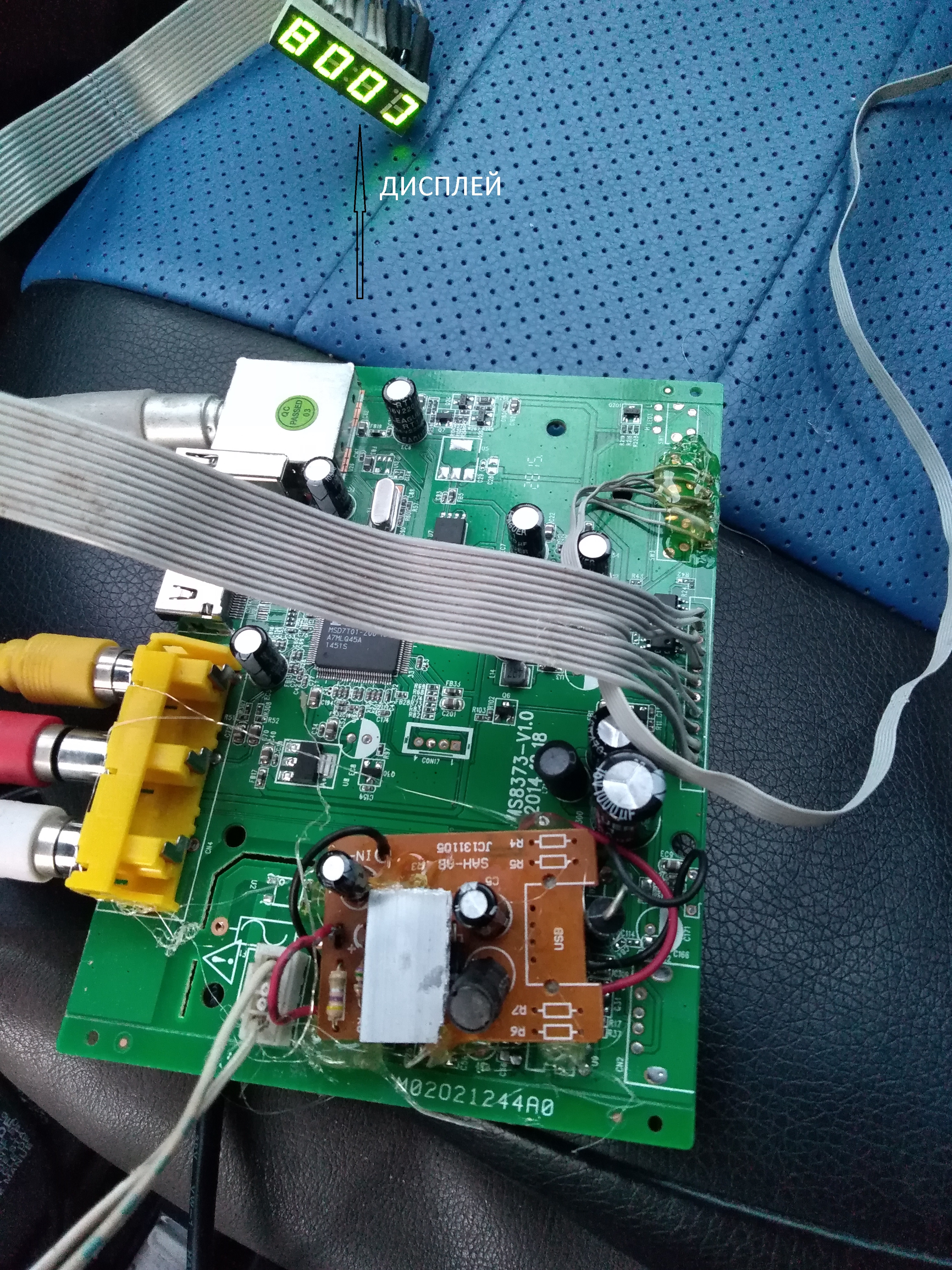 Отпаял с тюнера и удлинил шлейфом с сдюшника IR датчик, светодиод, дисплей.Собрал по временной схеме,соединил магнитолу кабелем RCA, антенну старую комнатную СССР на крышу машины.Результат на фото.До тв вышки 30км,прием увереный,да еще оказывается в тюнере игры зашиты, можно поиграть. IR датчик и светодиод внедрю на переднюю панель ,дисплей не буду выводить, на экране все отображается.