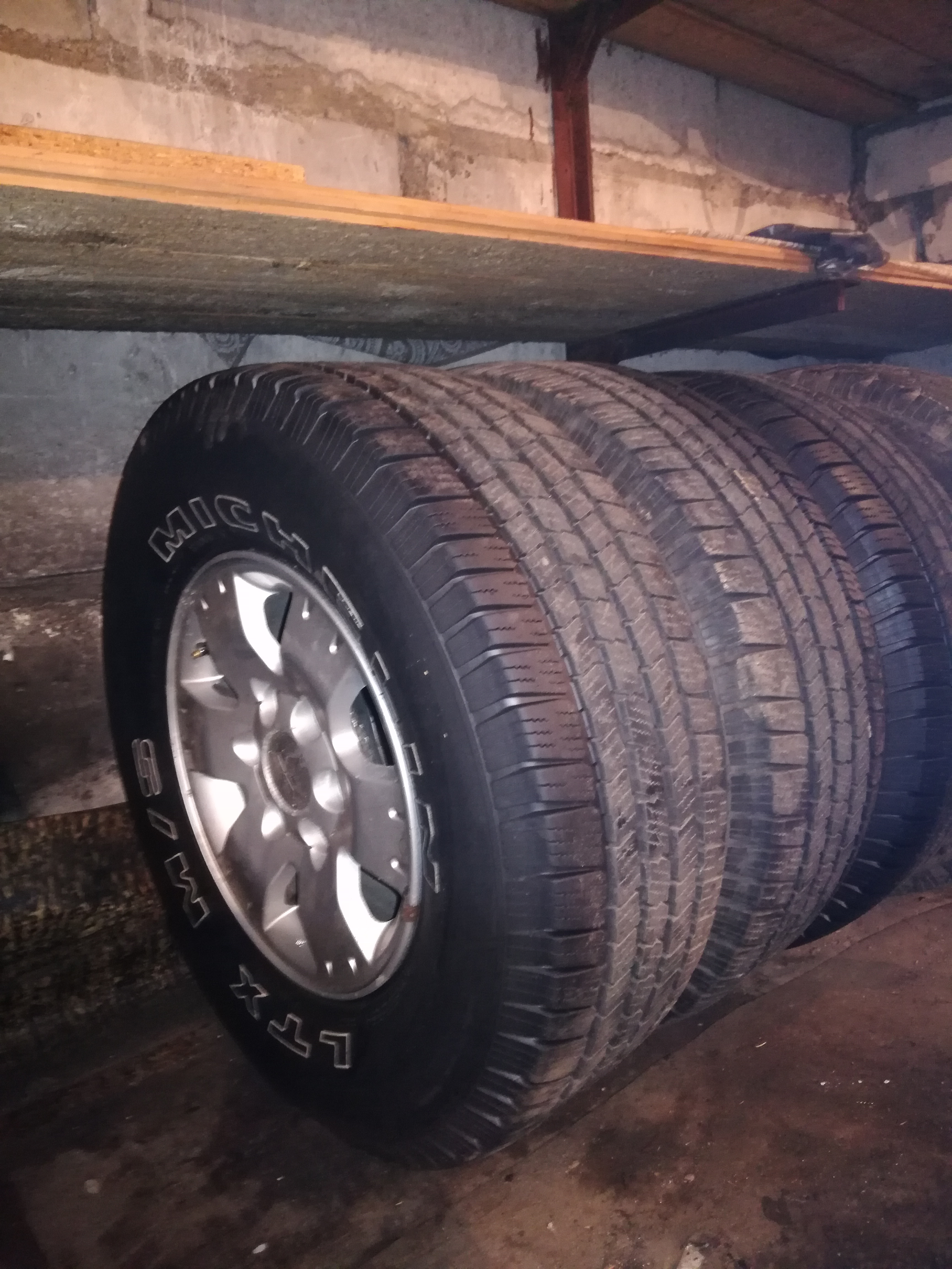 Зимние шины «Мишлен» на родных легкосплавных дисках - 5 шт. На машине всесезонка Yokogama Geolandar G039 на новых л/с дисках К&K. На заднем мосту 2-е новые, с прошлого года. Всего их 6 штук, 1-а без диска. Общее количество шин-10 шт.