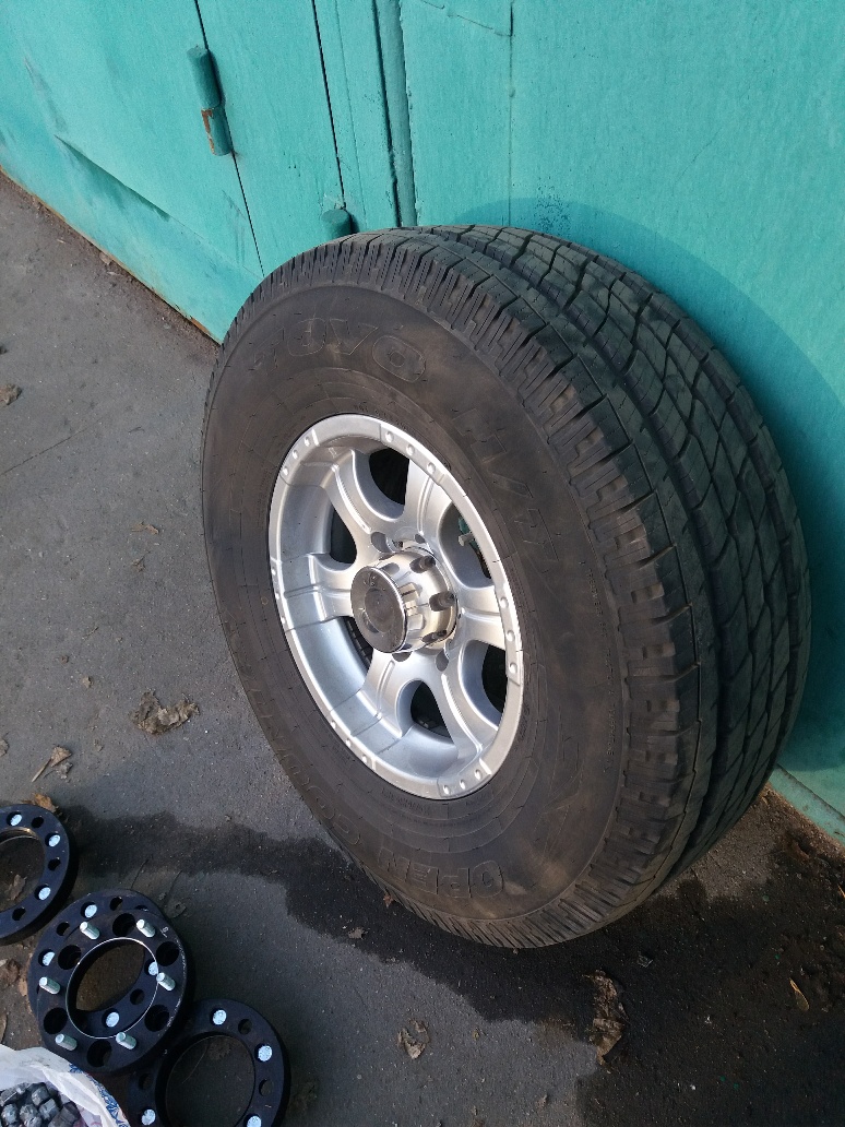 После продажи машины остались колеса на литых дисках, 265/70R15, пробег меньше двух тысяч км, резина Toyo Open Country H/T 112T, M+S, куплено в декабре 18 года, 5шт, глубина протектора 9-10мм, запаска не собрана, диск в коробке, резина с этикеткой, также в комплекте проставки 30мм, прикручиваются к ступице, а к ней прикручиваются колеса. С учетом вылета дисков, стоят шире оригинала на 20мм.