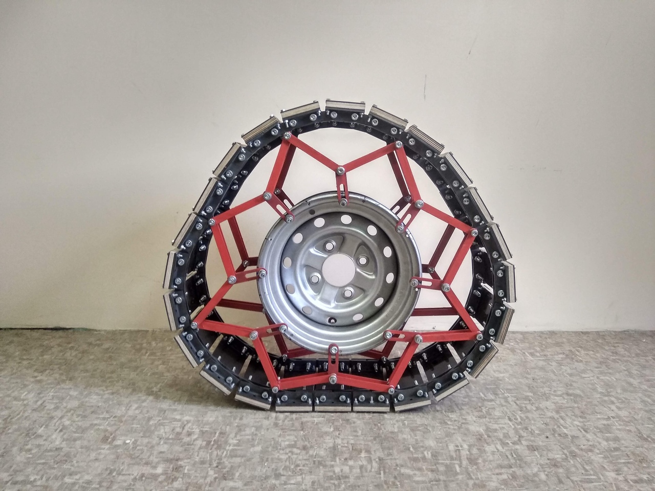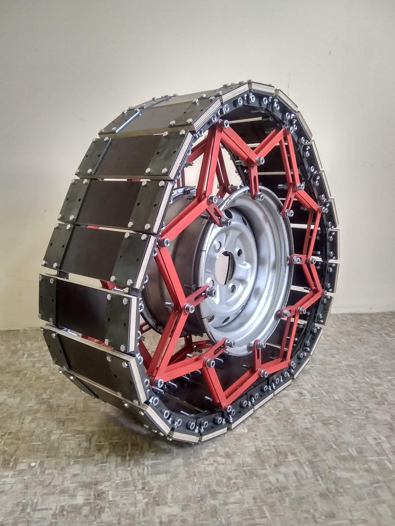 Спешу поделиться следующей версией колеса. Выяснилось (сами не знали), что теперь оно будет треугольным. Замечательная форма! Теперь это колесо мы сможем засунуть в арку автомобиля. Также, такая форма значительно снижает нагрузки на обод. Увеличилась площадь опоры.