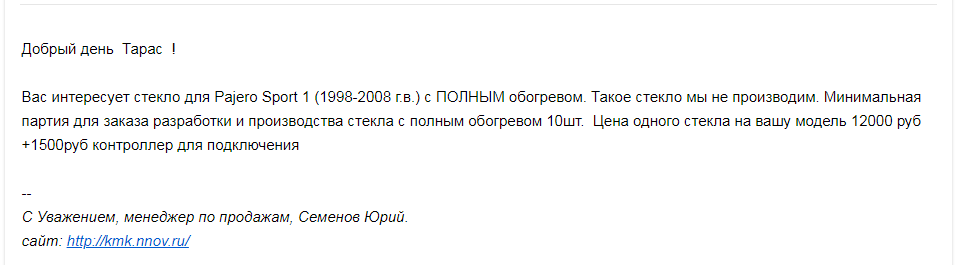 Получилось найти направление к решению: уже сейчас и не вспомню на каком из многочисленных просмотренных форумов я наткнулся на отзывы компании «КМК Glass», что находится в городе Бор, по ту сторону Волги от города Нижний Новгород… В общем: отечественный производитель, отзывы покупателей хорошие. Но самое главное – «Возможность изготовления стекла с полным электрообогревом на любой автомобиль» - гласит баннер на главной странице сайта компании. Однако, с небольшой припиской: «При заказе от 10 штук».