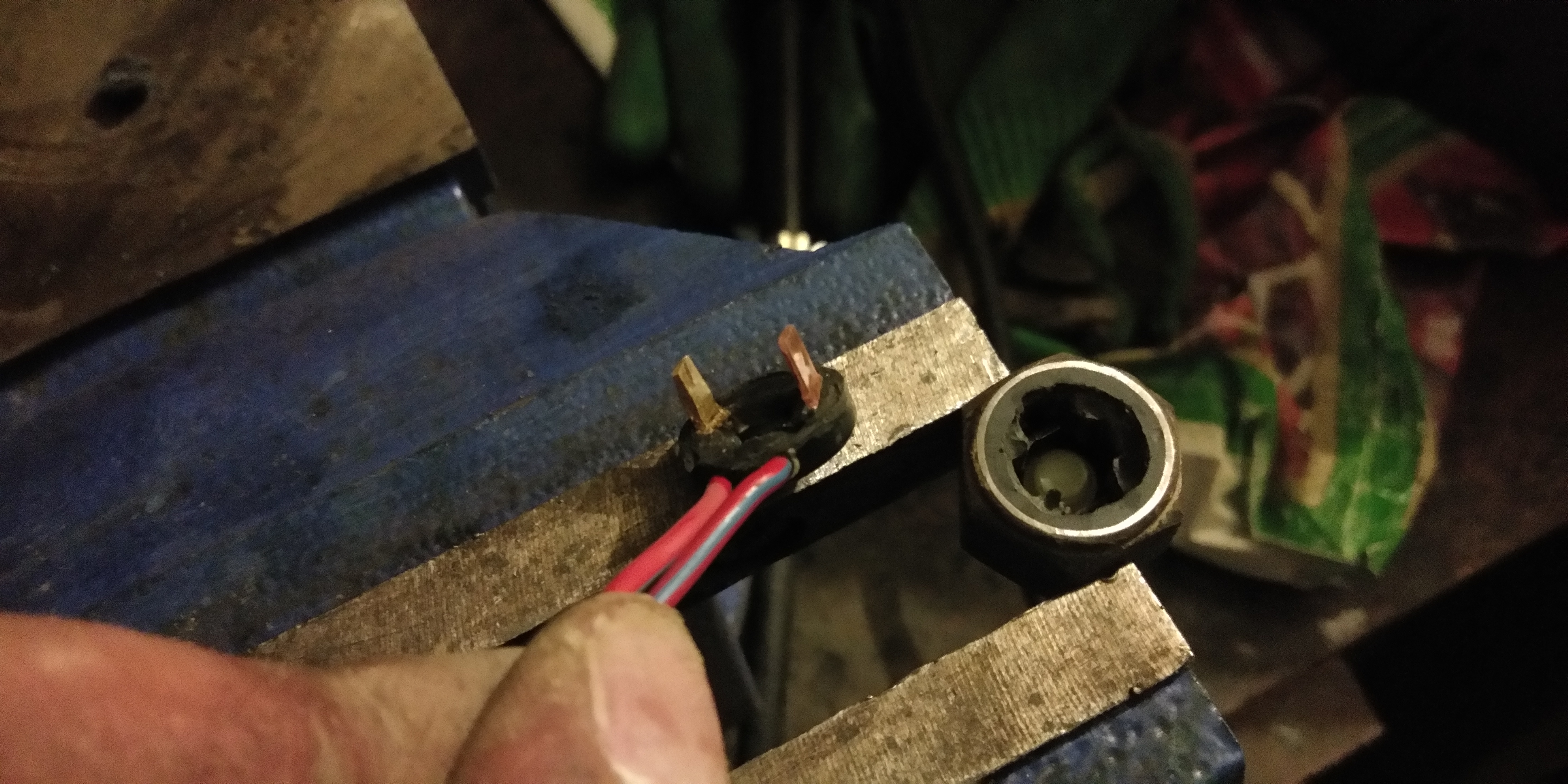 3. Мелкой ножовкой зажав датчик в тиски, аккуратно пропилил по кругу "шапку" которая заливает контакты (эпоксидная смола или что там я не знаю) сверху датчика. Глубина пропила будет чувствоваться по ощущениям, где то дойдете до контактов (не отпилите их), а где ощутите пустоту. В месте пропила отверткой поддел и "шапка" слетела как пробка. Ниже на фото видно тот самый получившийся колпачок с двумя контактами (которые при нажатии шарика замыкались) и сам датчик. Правда это я его уже гравером расколупал так как он то же был залит (кто будет страдать как и я, аккуратней, не повредите "лапки" в датчике, под эпоксидной смолой их не видно, постепенно не торопясь срезайте её).