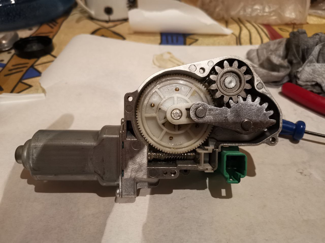 Сейчас вот думаю у кого бы попросить сделать фото того как должно быть? Или может кто владеет этими сакральными знаниями ... (на фото вид редуктора моего, может кто все-таки сможет подсказать какое "начальное" положение должно быть пластиковой шестерни)