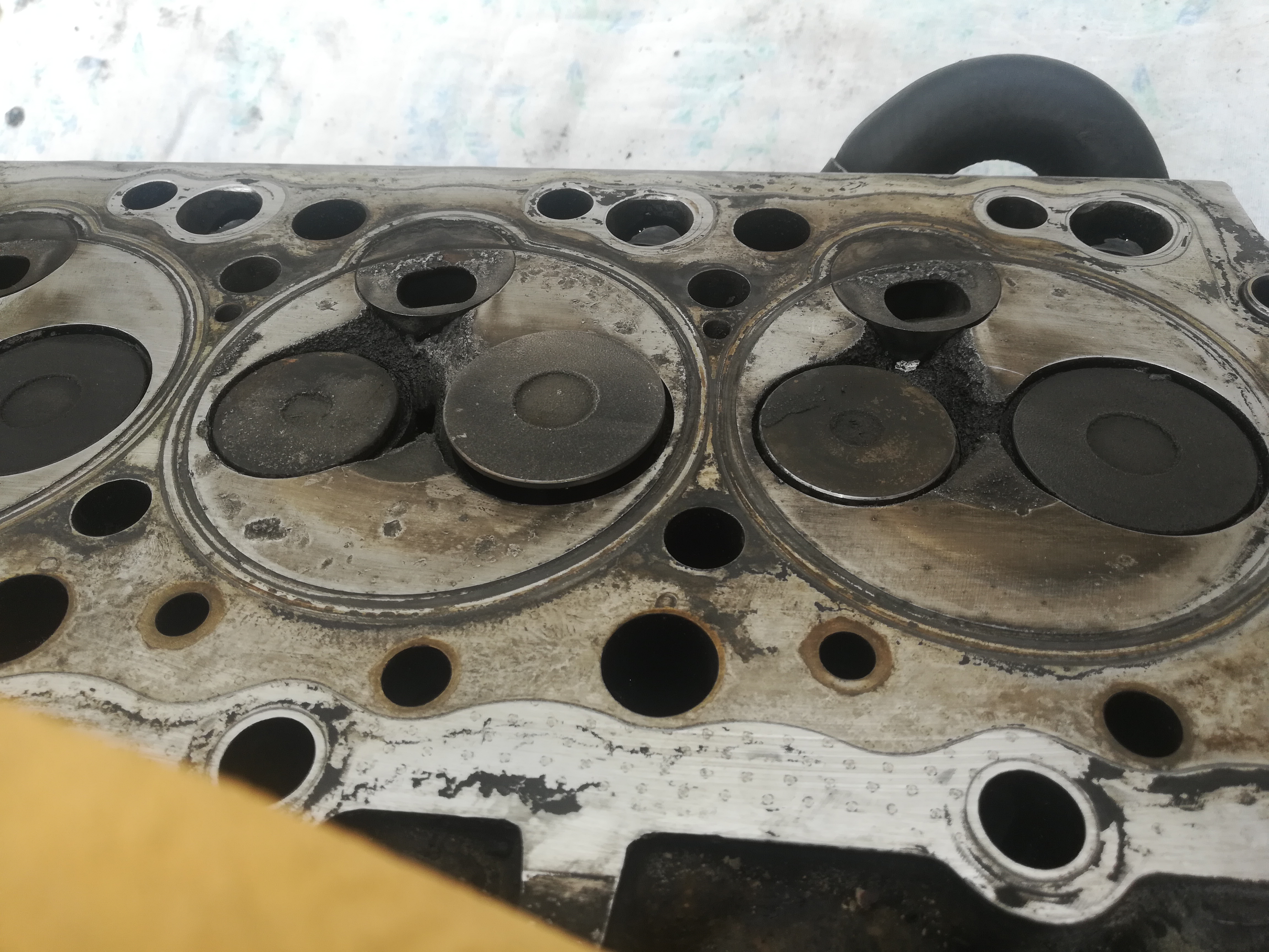 налицо явный систематический перегрев мотора, поверхность ГБЦ вся промята, в неплавленых цилиндрах трещины, судя по всему есть неисправность в системе охлаждения. В какой то момент в цилиндры пошла ОЖ, уровень в системе упал и мотор остался без охлаждения. Наверняка прокладка ГБ вся уже рассыпалась, а болты при разборке откручивались легко.