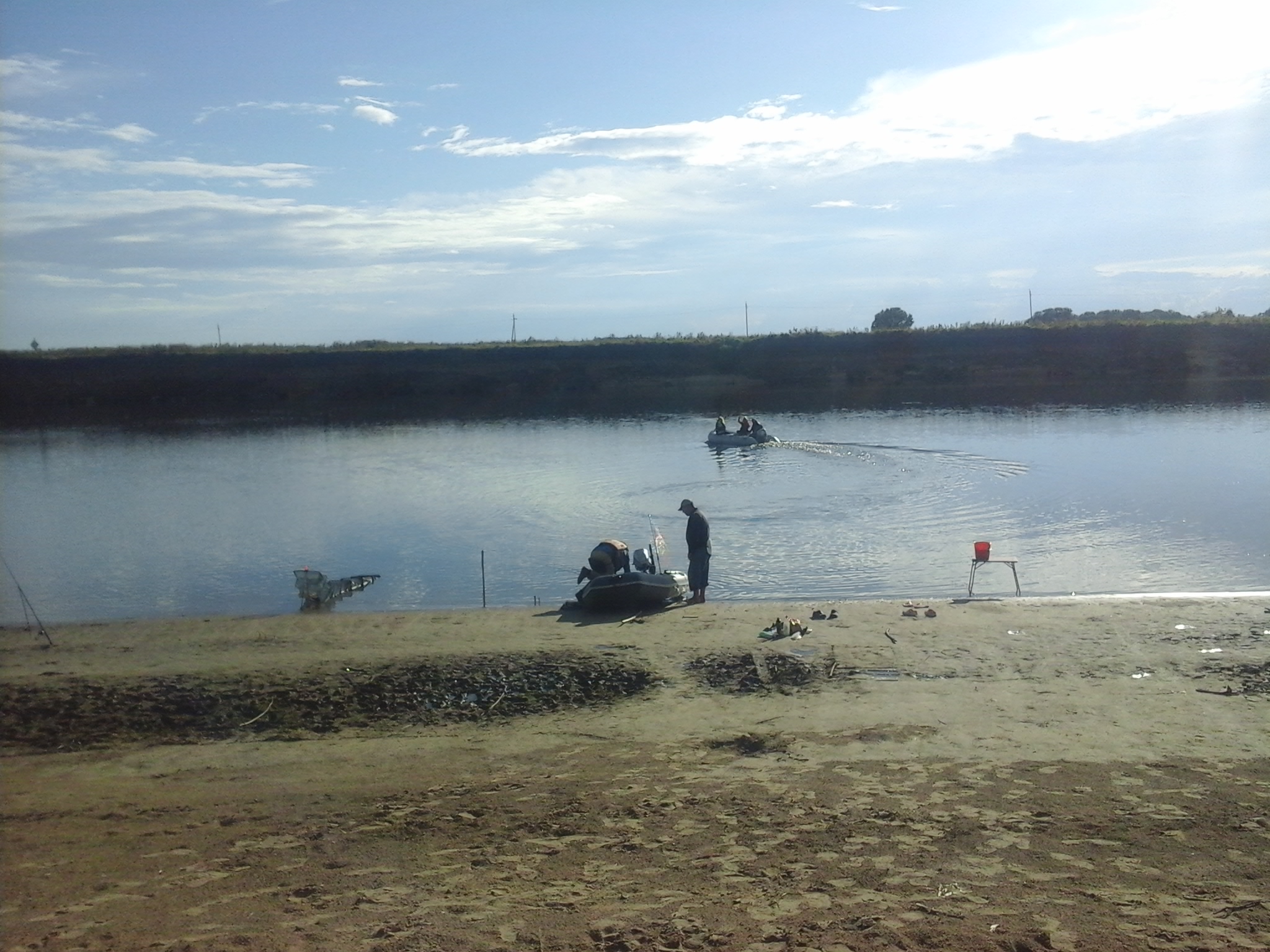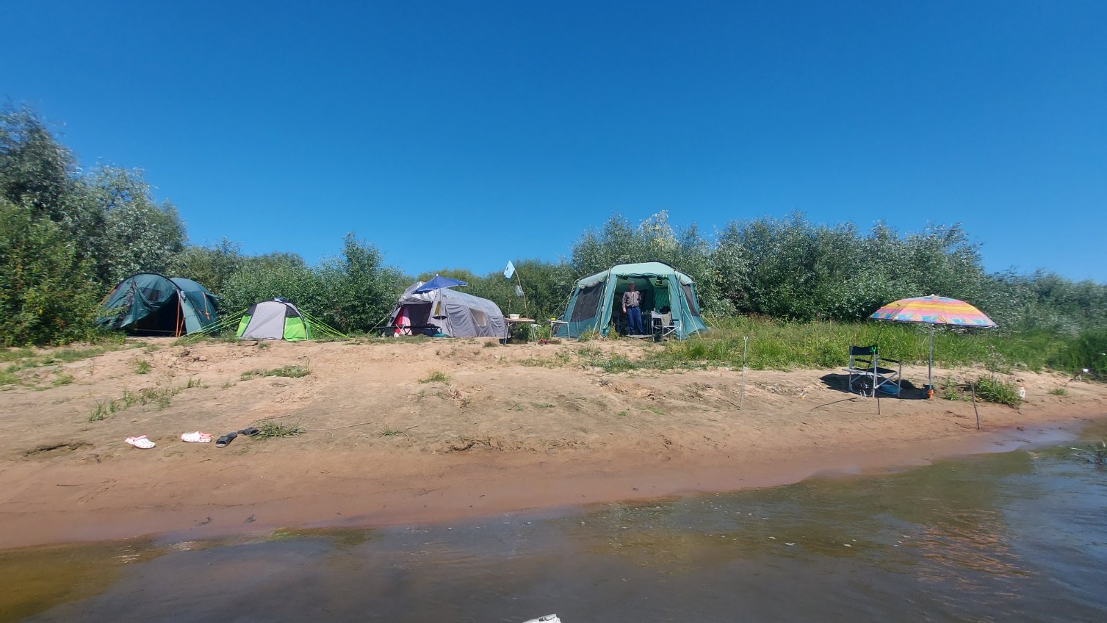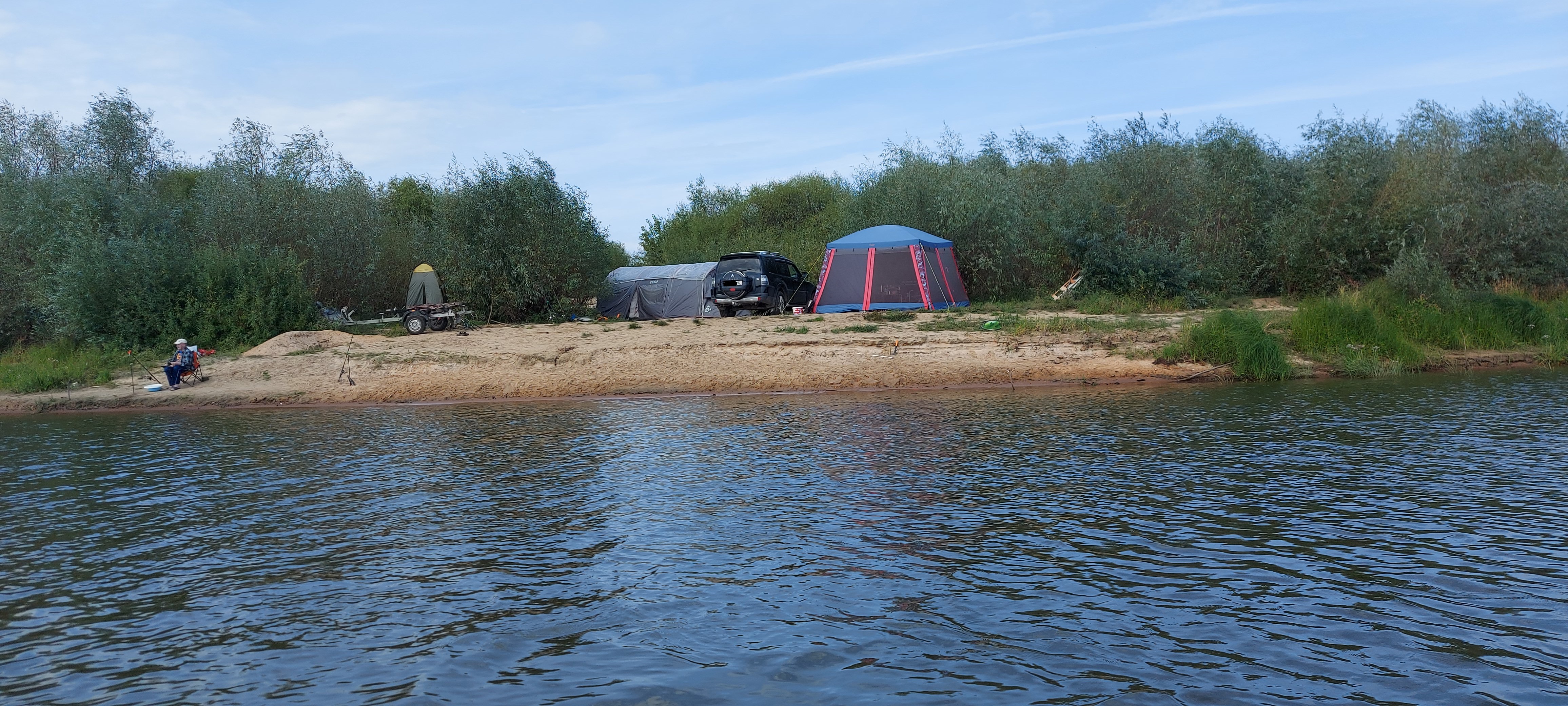 ... Дождь, но тепло. Лагерь разбили, но лодку не спускали, стоит под тентом. Ловят тупо с берега...