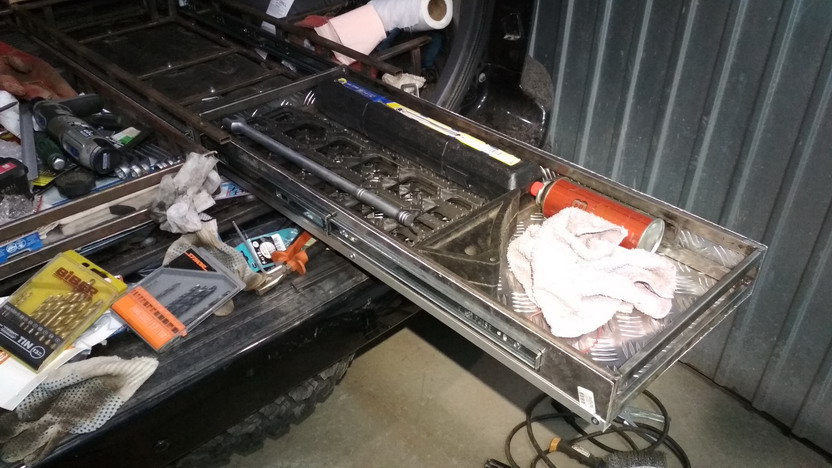 ящики обшил алюминием - это дорого, но съедает намного меньше места, чем дерево. Для верха использовал влагостойкую фанеру. Направляющие - длиной 700 мм, с нагрузкой 50 кг на пару. Хлипкие дешевые не подойдут - ящики с содержимым весьма тяжелы.