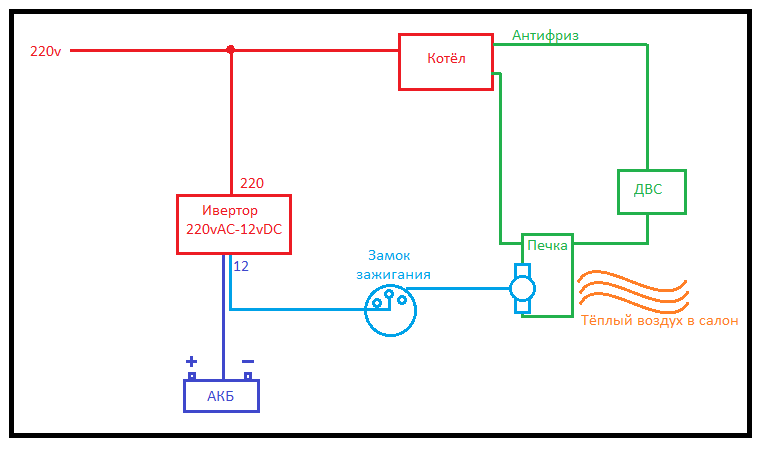 представьте, что в машине имеется инвертор 220-12 (типа ИБП от компа, только киловатта на полтора), и при включении котла подогрева, берем 12в и подаём на ПЕРВОЕ положение замка зажигания, жтим самым мы запитываем бортовую сеть автомобиля от бытовой розетки. Зачем, спросите вы? А я отвечу — только для того, чтобы в течение того времени, пока машина стоИт на подогреве, я мог еще и моторчик печки включить, чтобы он уже нагревал салон. Всё-таки в подогретый салон садиться куда приятнее. Также от этого ИБП можно заряжать аккумулятор. А еще неоспоримым плюсом этой затеи является тот факт, что инвертор от ИБП может работать в 2 стороны, т.е. появляется еще и розетка на 220в для непредвиденных нужд в полевых условиях.