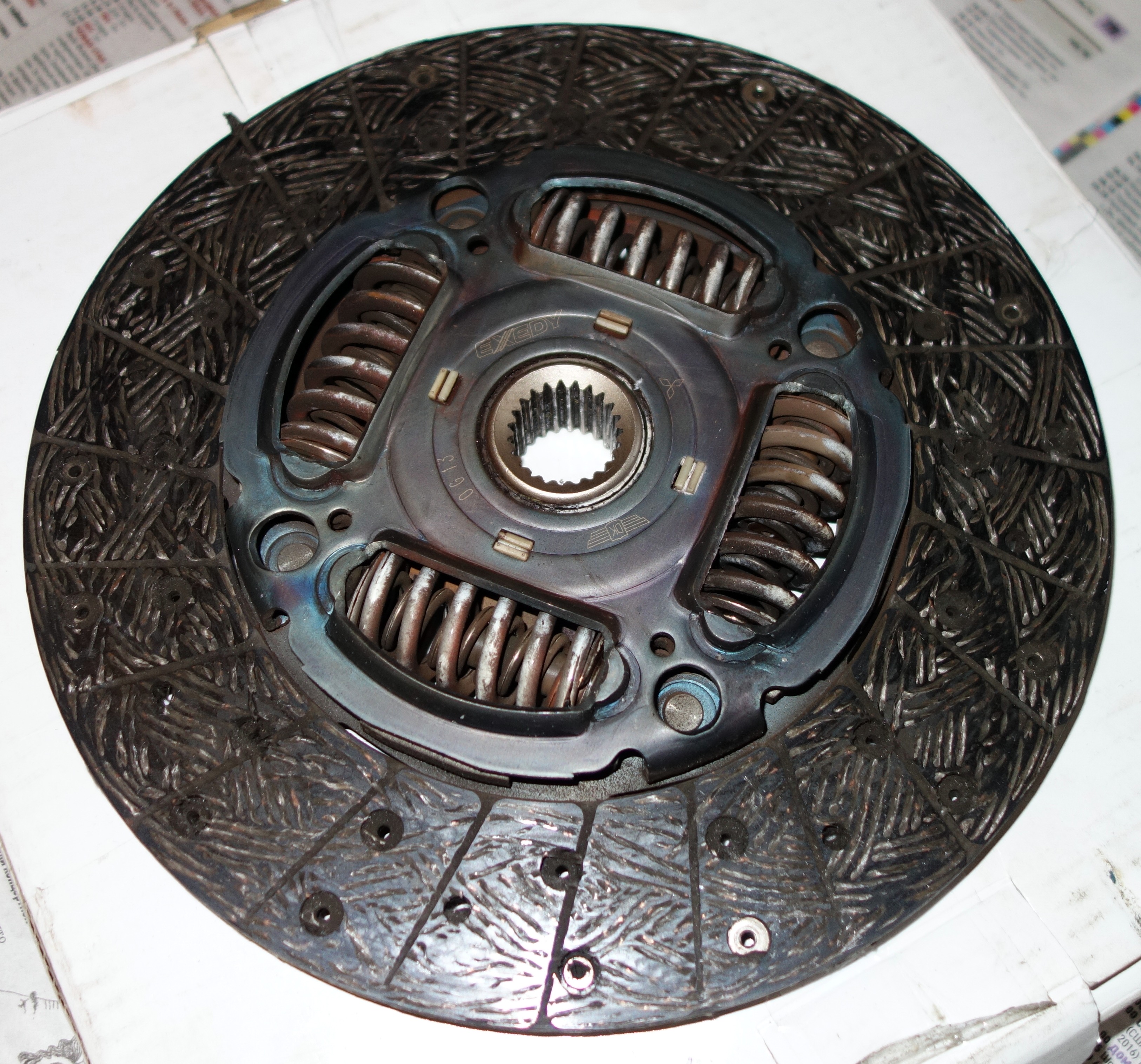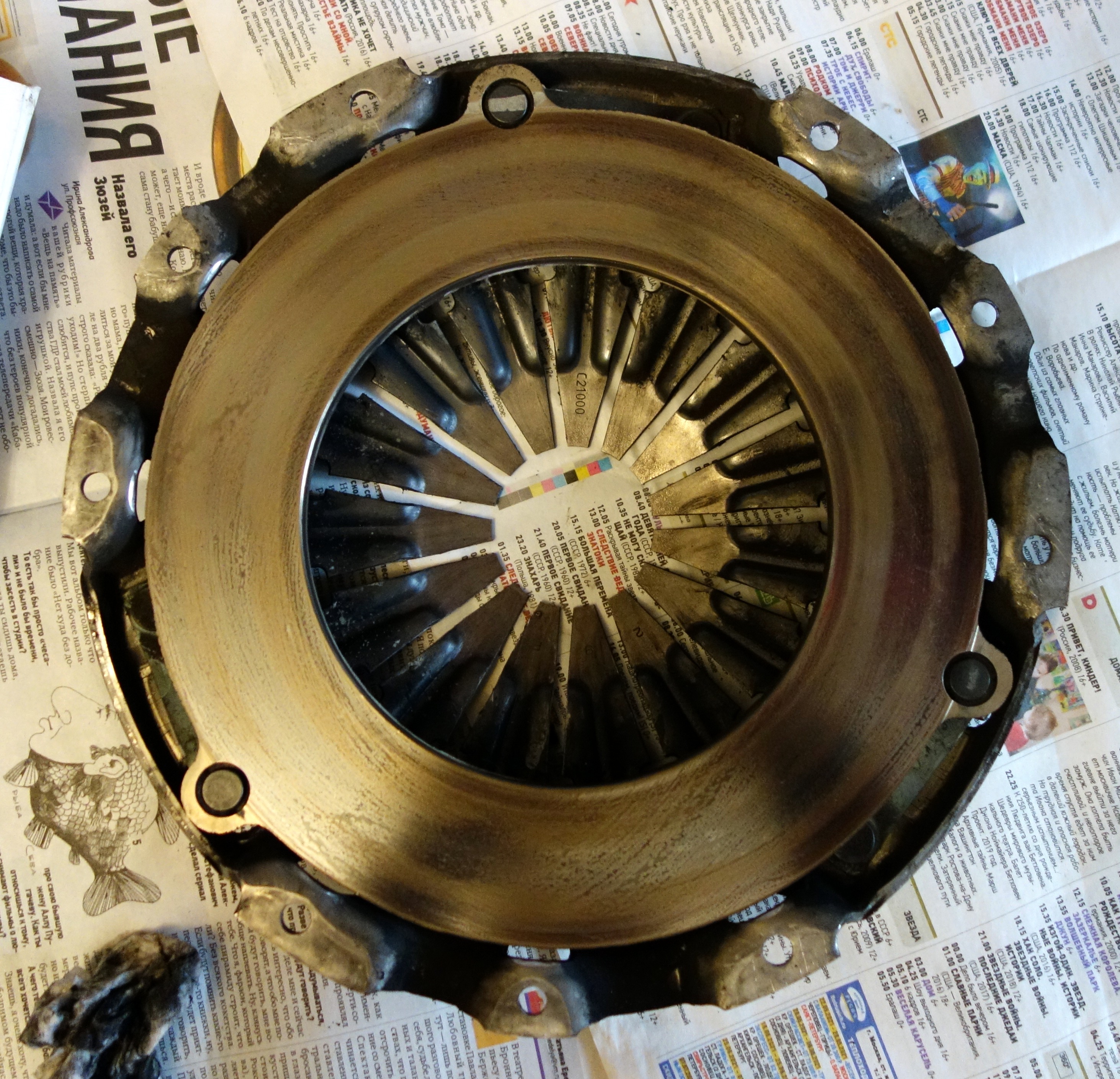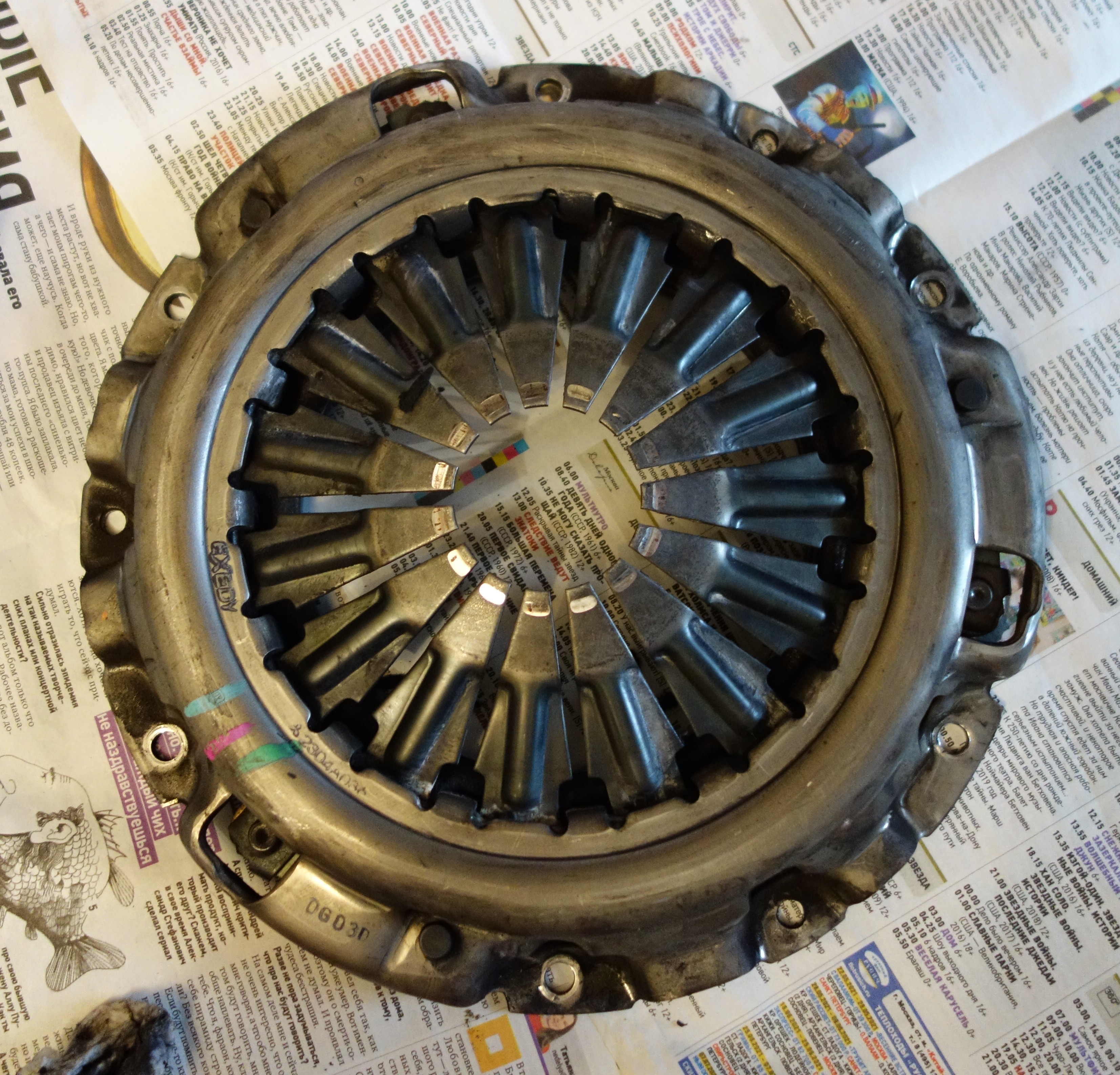 Корзина (2304A036): а) Со стороны лепестков - небольшая выемка на лепестках от выжимного. Высота лепестков - одинаковая, разницы нет (на нее есть какой-то допуск, но величины не помню). б) Со стороны прижимного диска - забуревшие кольцевые подпалины (?) на диске...