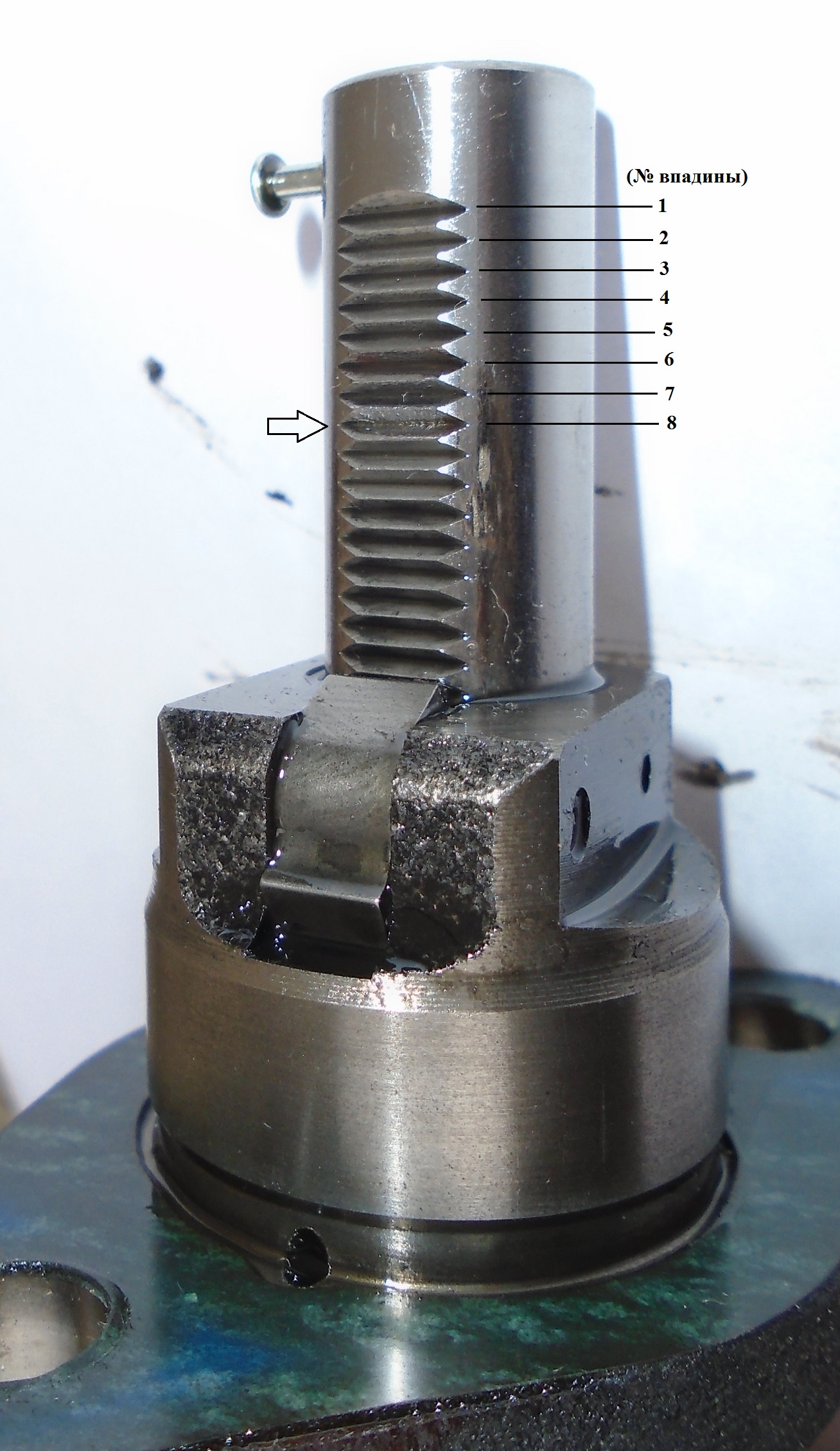 Есть некоторый износ зубчика: По поводу впадин - читал вот это: Получается, что у меня он работает на 8-й впадине: Единственное, непонятно, почему отчетливый след только на одной из впадин, ведь по идее натяжитель долго работает и на других впадинах и там тоже должны быть следы.