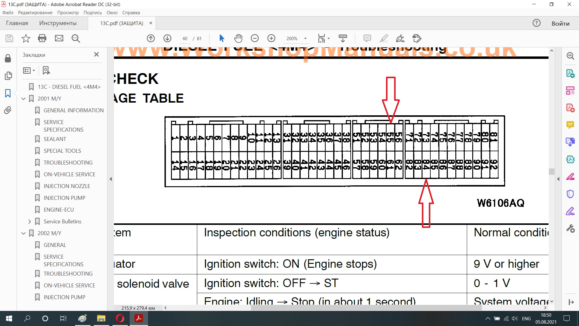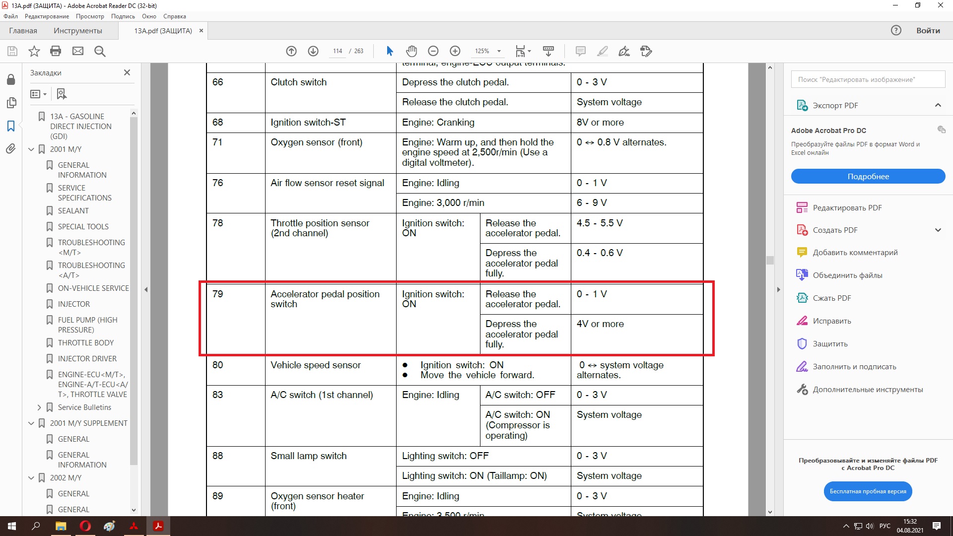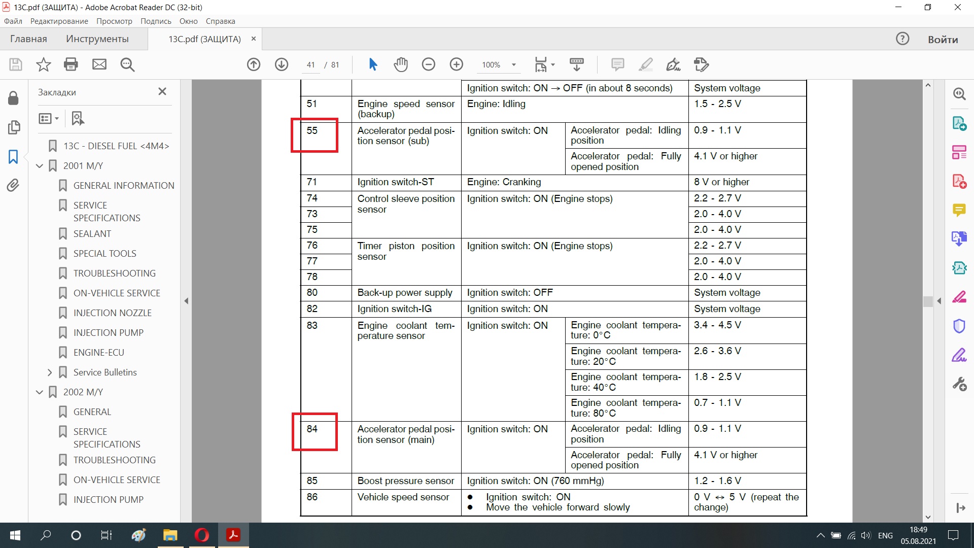 Для 4М41 цифры такие: значение датчика по цепи APS1 - 0,985-1,085 В (зажигание вкл, педаль отпущена). При полностью нажатой педали - 4,5 В.