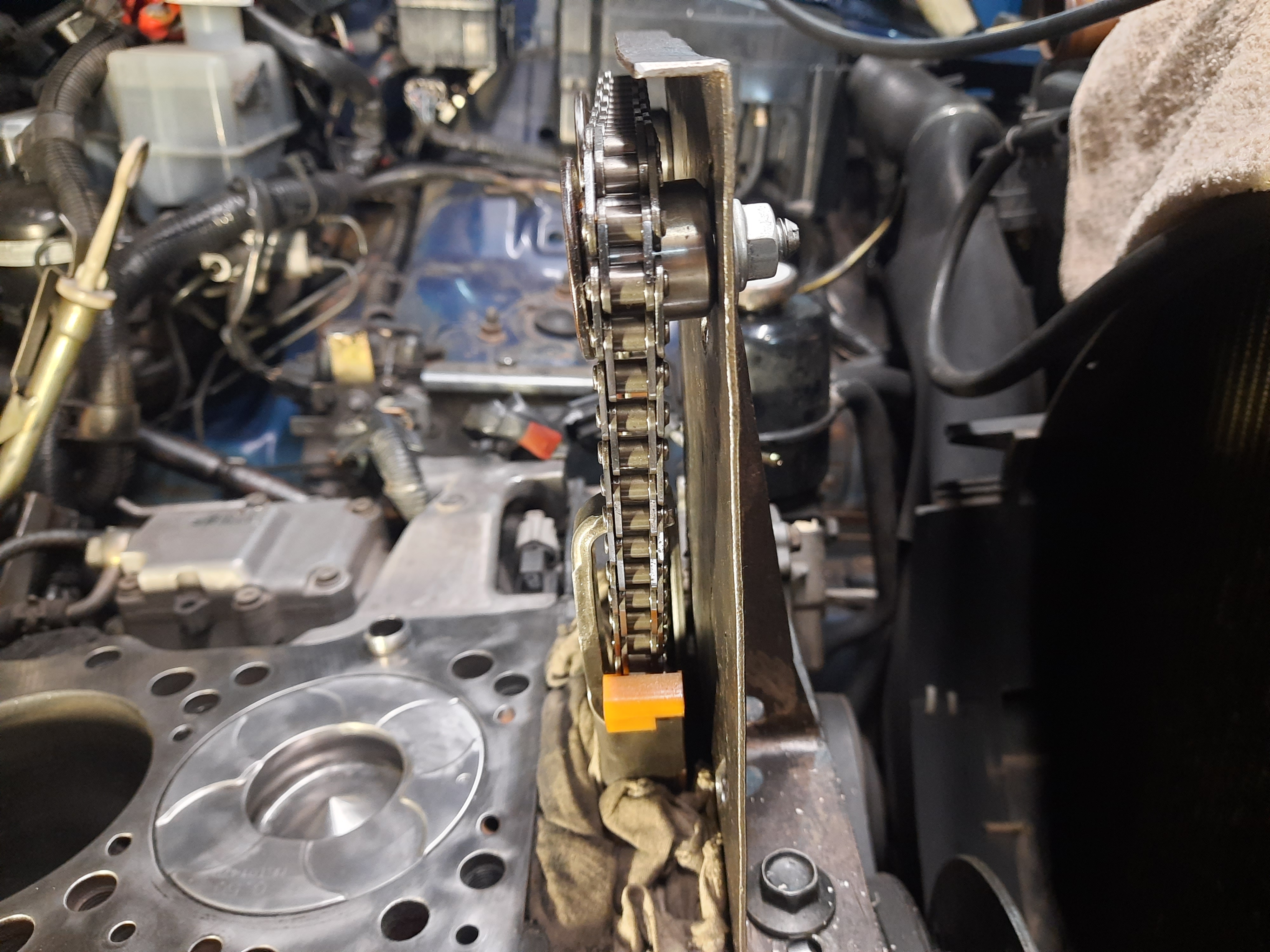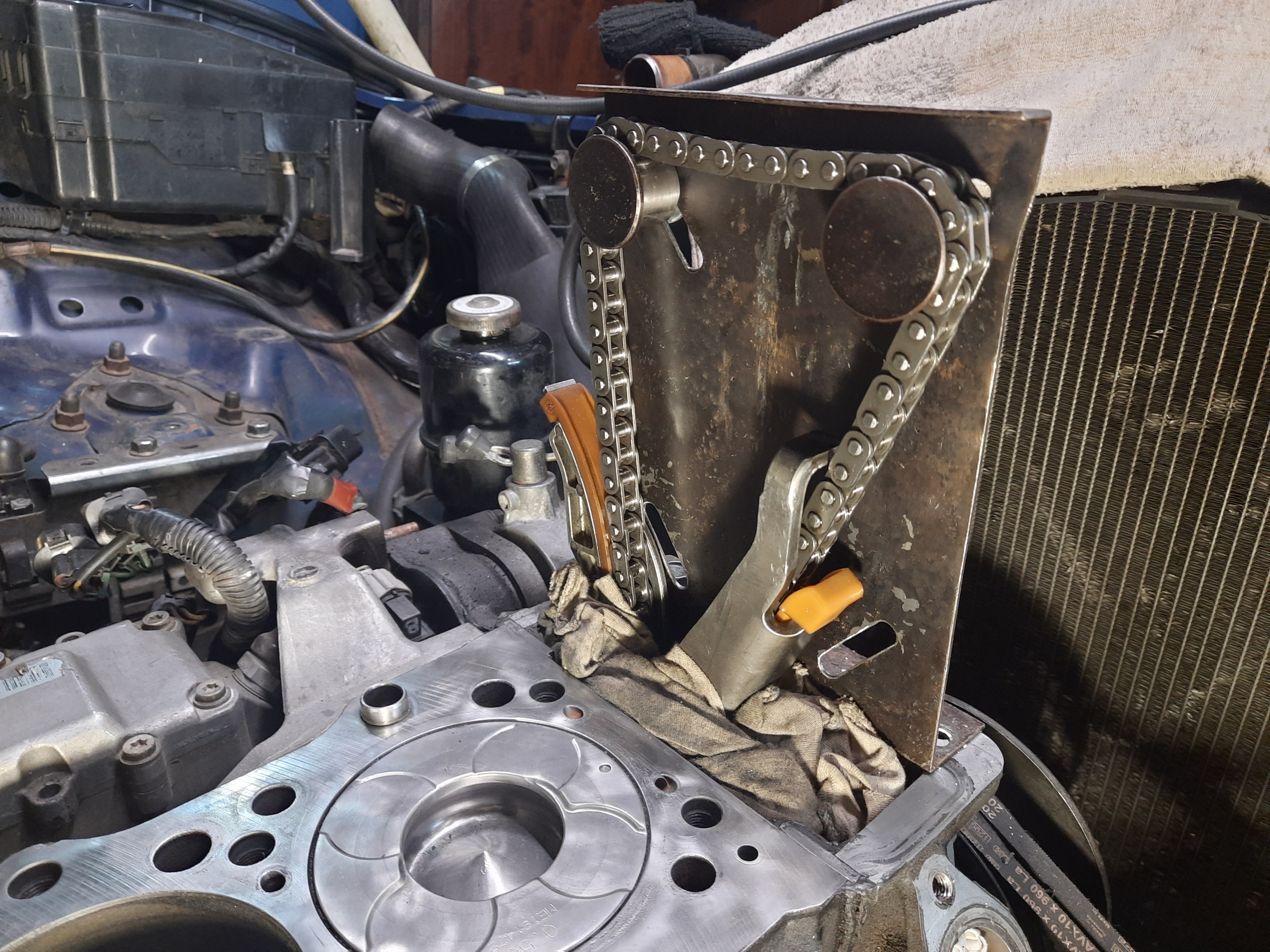 Плюс, лично я себе изготовил для этих дел приспособу, типа оригинальной, на которую накидывается цепь и которая позволяет крутить коленвал туда-сюда без боязни просохатить цепь вниз и дать ей перескочить на зуб. Без нее, когда распредвалы сняты, крутить колено стрёмно, это тоже задерживает работу.