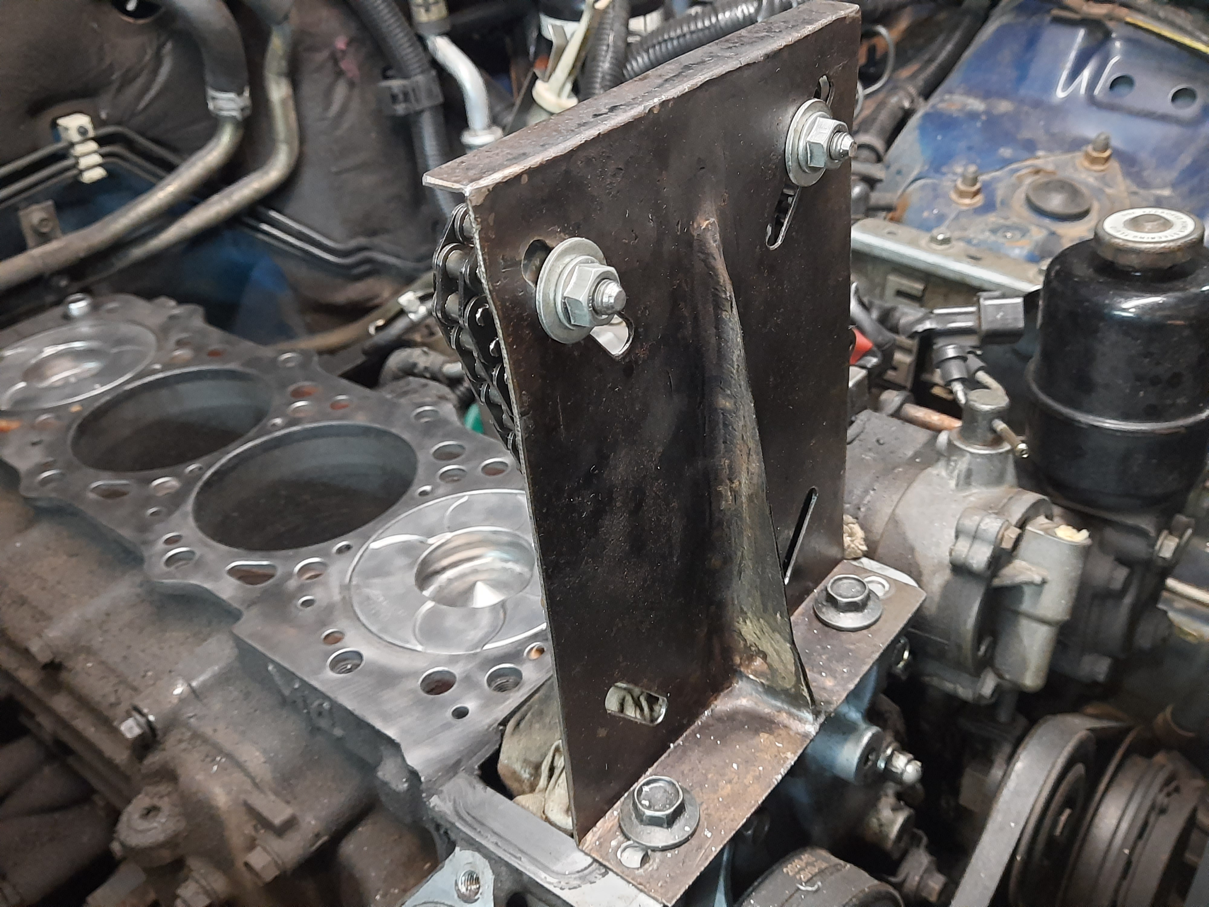 Приспособа может крепиться как к блоку цилиндров, так и к ГБЦ. В последнем случае ролики переставляются в нижние прорези.