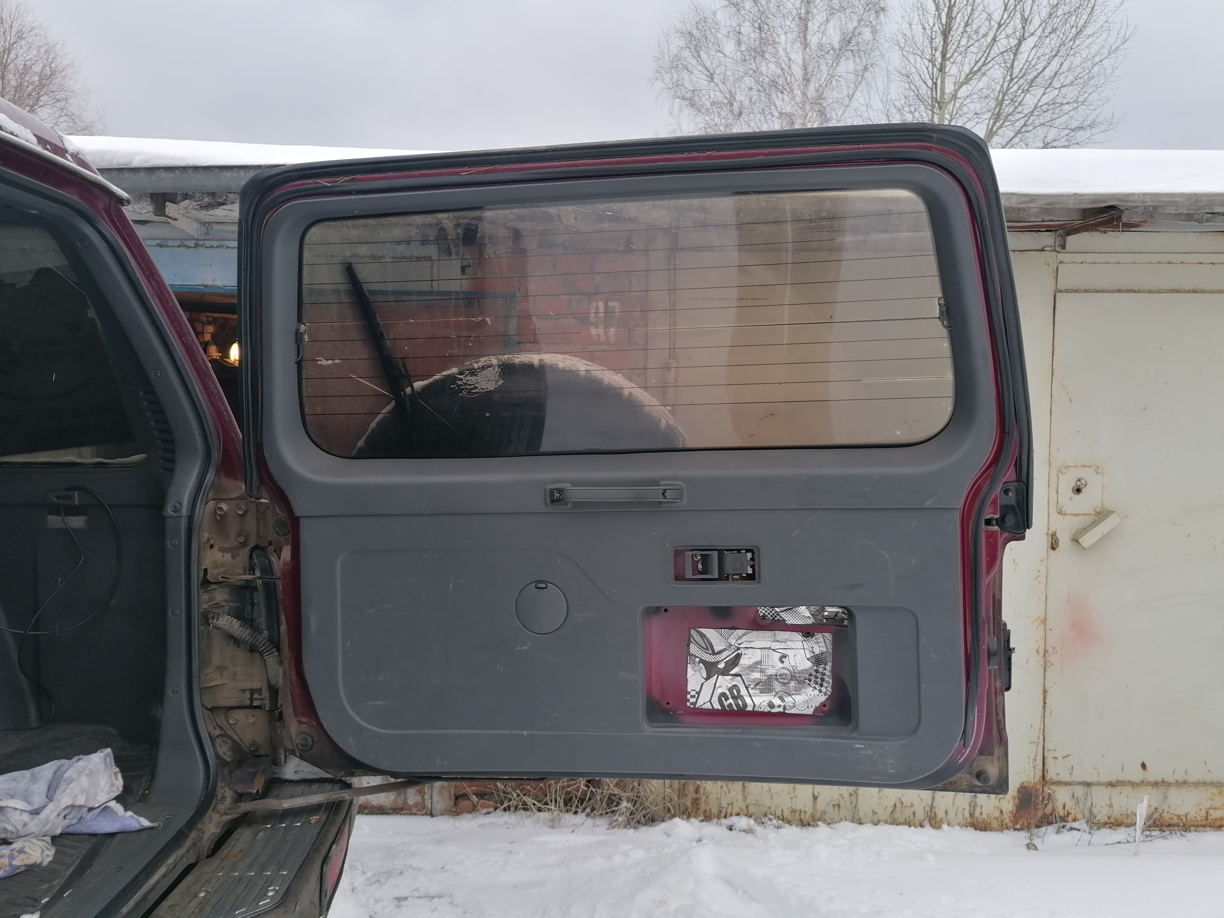 - задняя дверь в сборе, цвет вишневый, состояние нормальное, немного ржы есть, дыр нет - 2400 р