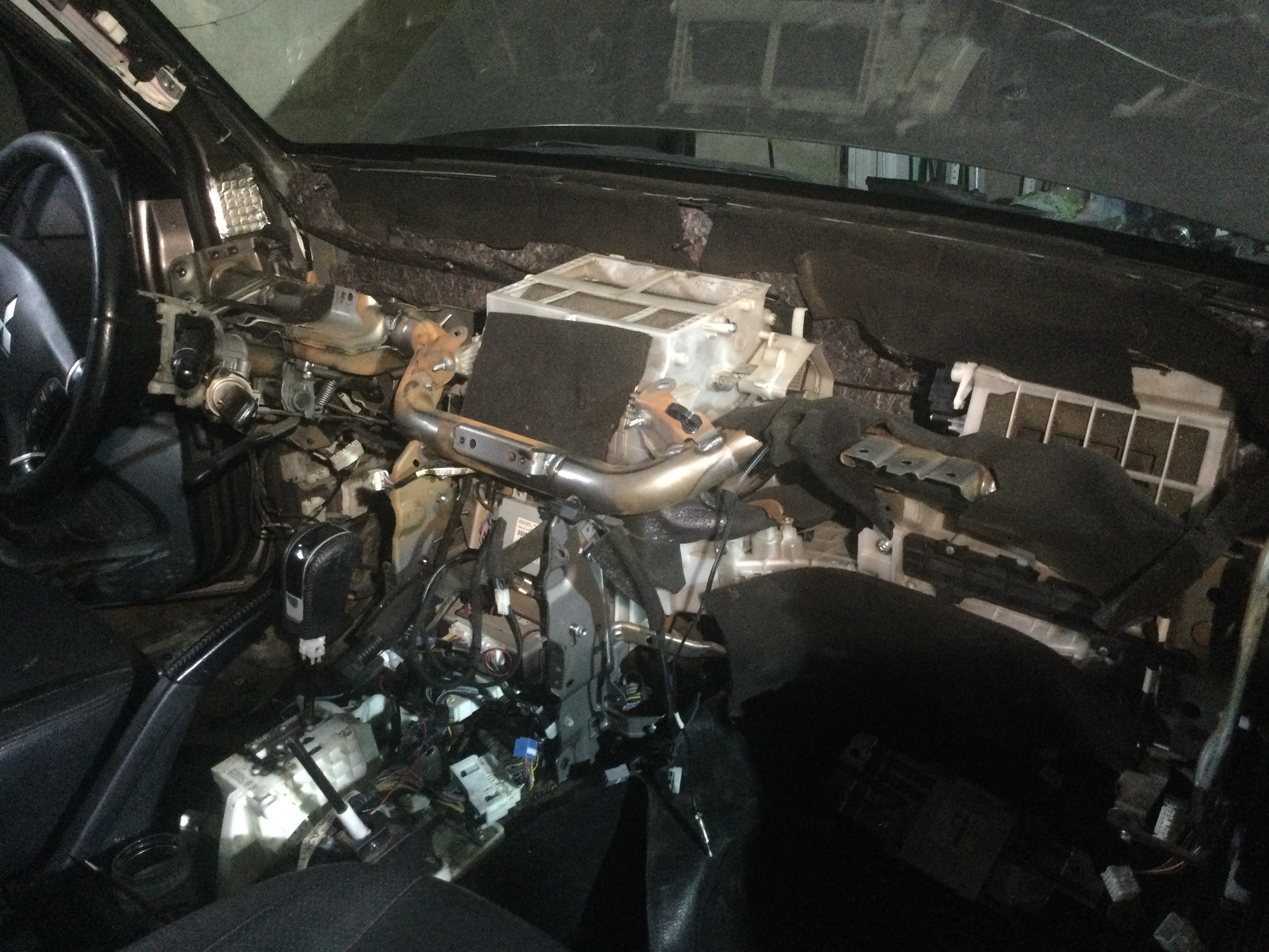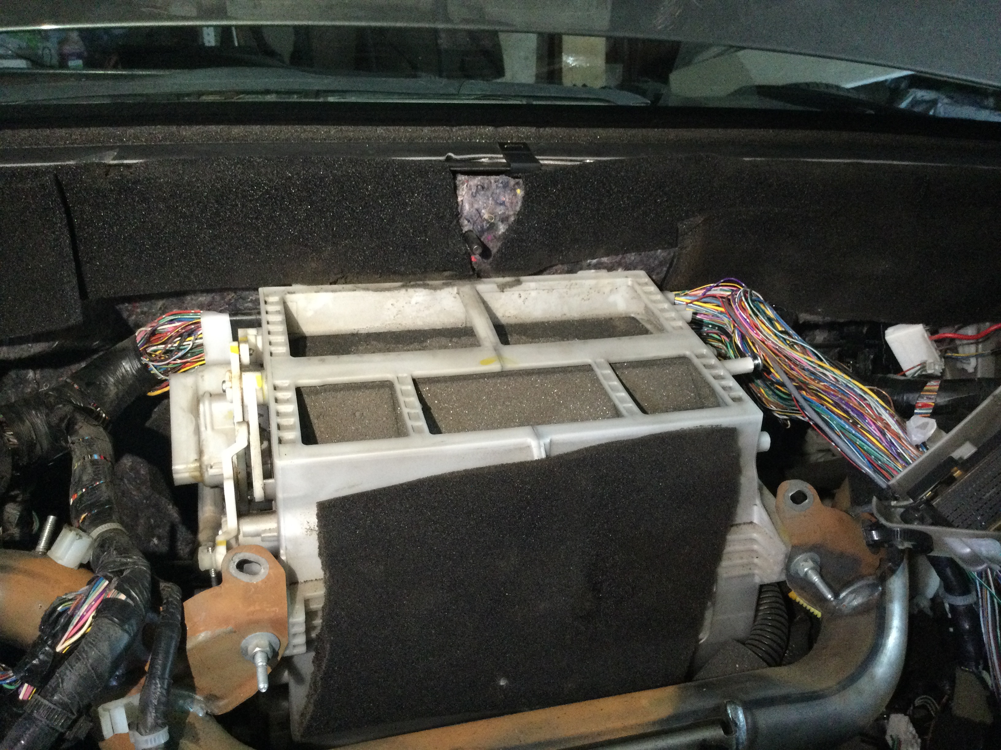 Я открутил поперечную балку от кузова, на которой всё это крепится. Открутил от балки правую часть климата где вентилятор климата и подал балку внутрь салона. Блок климата подался вперед сантиметра на три. После этого распустил изоленту над лотком и вынул косу проводки. Лоток остается прикрученным к климату. После ремонта или покупки новой проводки верну всё назад в обратном порядке.