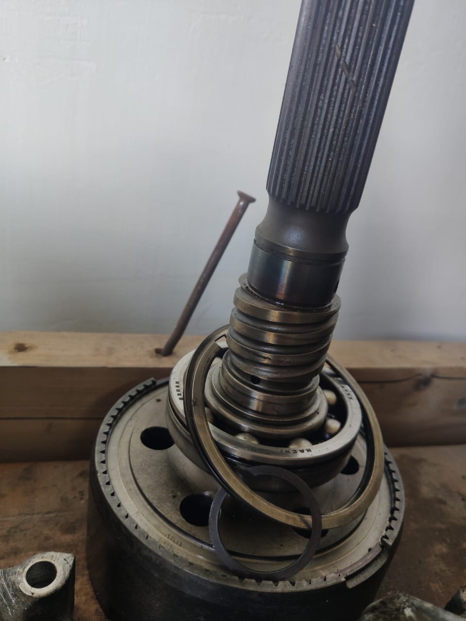 Только после этого удалось снять хвостовик. Сальник в труху и вкладыш в выработкой сильной. Вопрос.