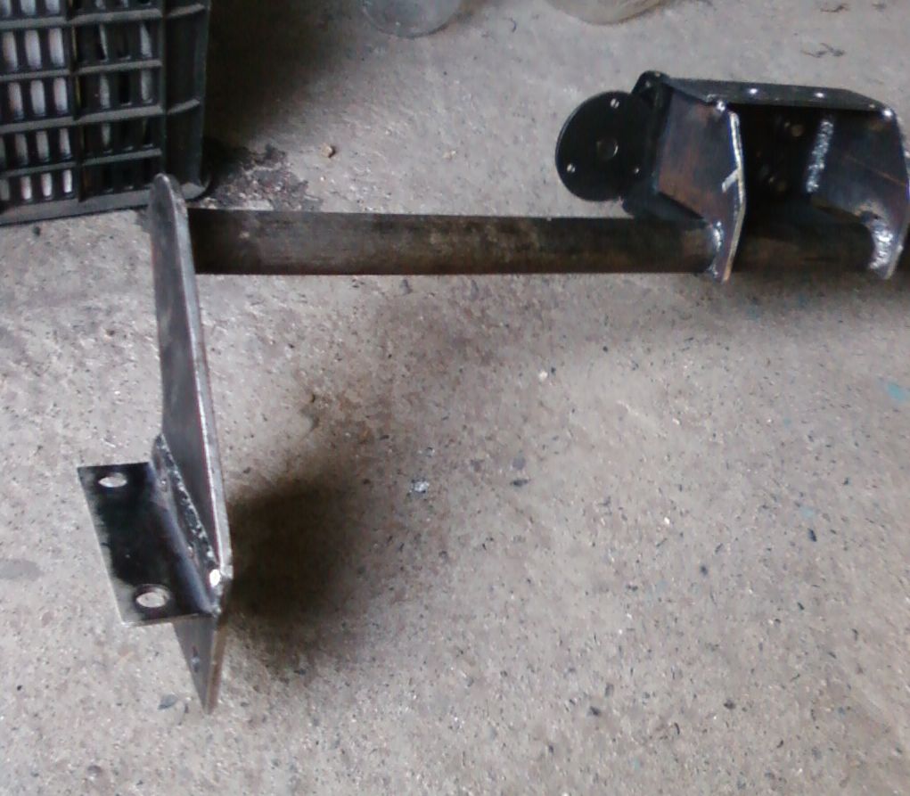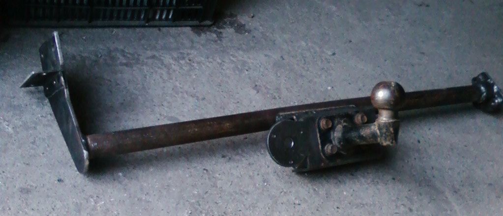 Так в процессе работы выглядел. Профильная труба 40\40 3мм, Пластина под шар и "уши" 5мм. Крепление слева в штатные резьбовые под буксировочную проушину, справа два отверстия (мною просверленных) в раме и через шайбу в транспортировочную проушину.