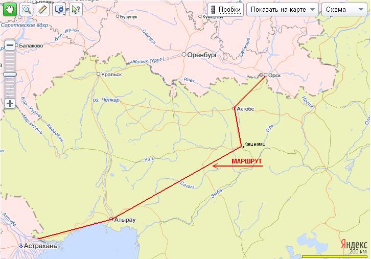 Маршрут: Челябинск-Орск-Актобе-Сагыз-Атырау-Астрахань.