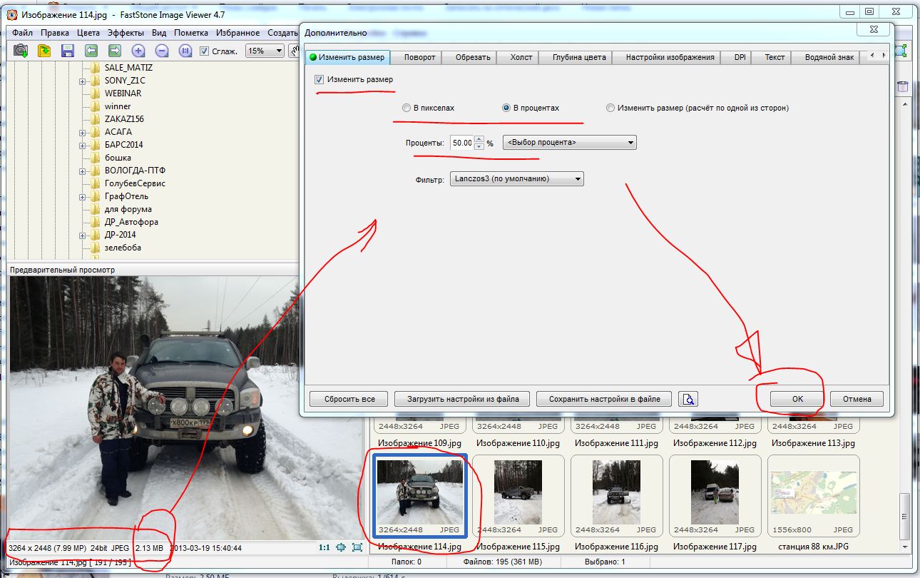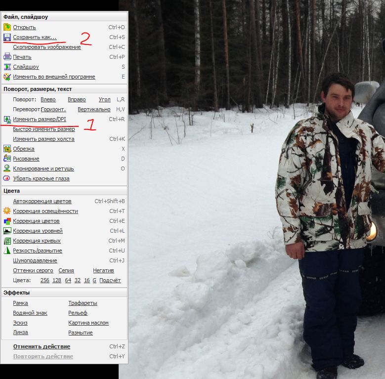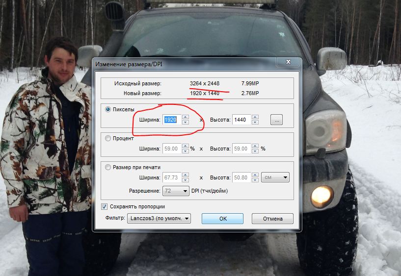 Как определить до какого размера уменьшать? Ответ простой. Вы размещаете фото в Интернете. Типичное разрешение стареньких мониторов 1280 на 1024 пикселя, приличных современных 1920 на 1080 пикселей. В моем примере картинка с одной из сторон более 3000 пикселей уже явно избыточна для того что бы просто посмотреть. Более того видно что размер файла больше 2-х Мб, и она просто "не влезет" на форум. Надо уменьшать.