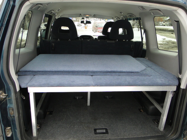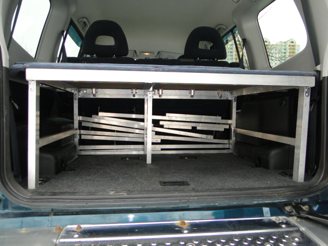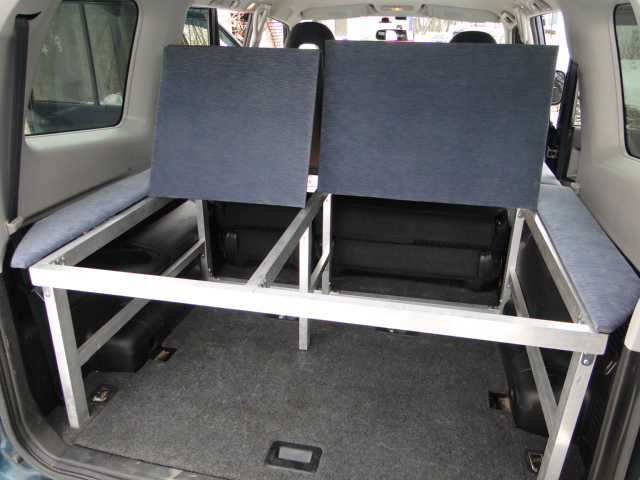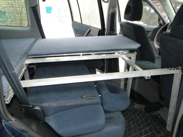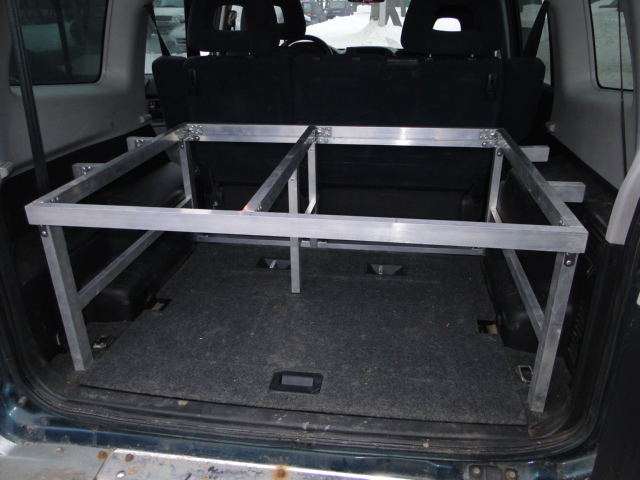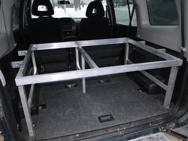 Вообщем открыл все двери в машине и начал ползать по ней с рулеткой, набросал чертежик и погнал на рынок за материалами. Купил два вида аллюминевой профильной трубы, уголков анодированных 2 вида, дверных петель и пол кило заклепок. Два дня не прошли даром, задняя и передняя часть каркаса собрана, осталось сделать соединительный крепеж, этим займусь на днях. Задняя часть уже стоит в машине, просто в распор по габаритам, доступ в нишу куда уберается третий ряд сидений остался свободным (там у меня инструменты, домкрат, трос и тд и тп)