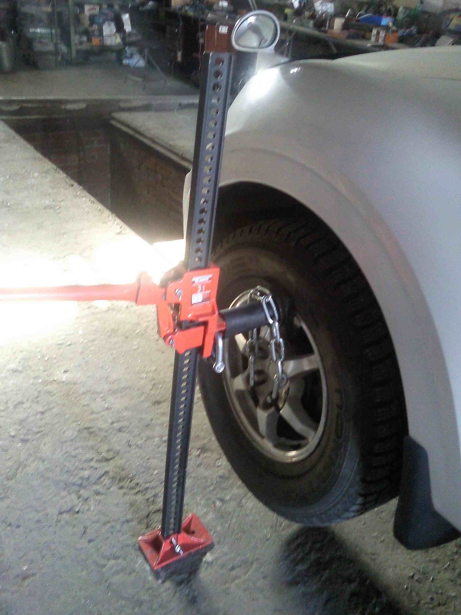 Выглядит както ненадежно... Хотя поднимать удобно. Надо еще подставку на длинной палке под рычаг тогда сваять, и колесо менять можно.