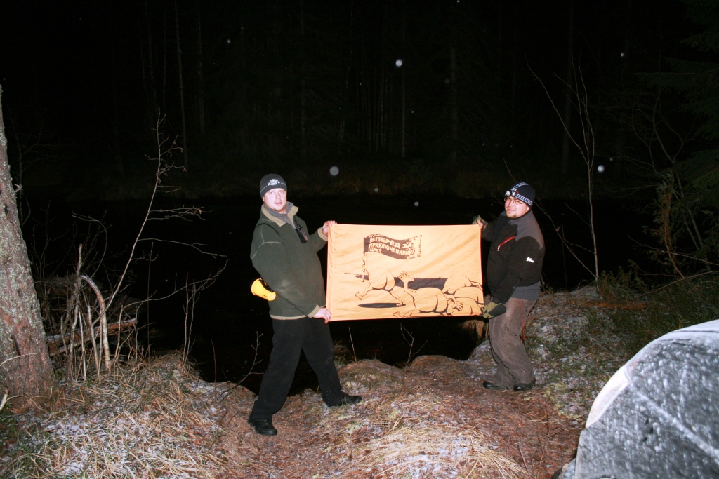 Далее был тяжкий выбор: переть в объезд по дороге практически общего пользования и как-то выходить на Линдозеро, либо ехать по той тропке, которая на 500-метровке обозначена пунктиром. Решено было подарить себе 15км ночного спецучастка о_О Фото оттуда как-то не удались из-за темноты, но к девятому километру этого участка растительность между бороздами колеи начинала напоминать уже деревья. Спасибо отважному Патриоту, который ехал этот участок первым.