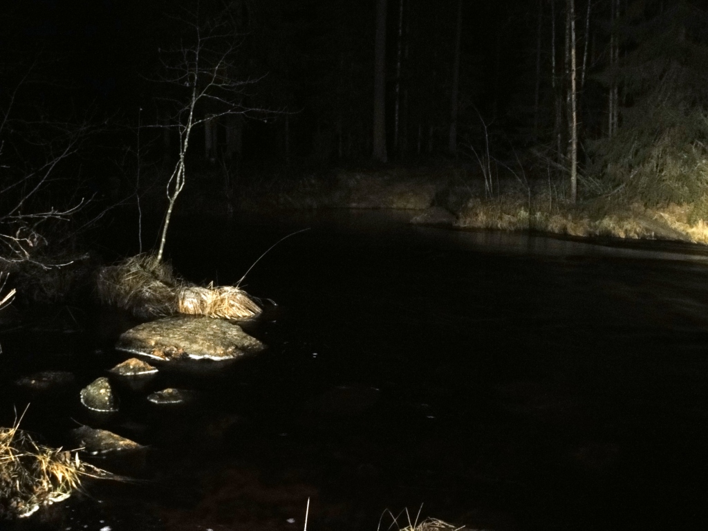 Приехав к реке Дяньга не без удивления обнаружили отсутствие моста, а торчащие останки моста да вкупе с полной темнотой дали понять, что здесь не проехать НИКАК. За сотню метров от "моста" успели приметить отворотку, растительность на которой вроде как казалась более потрепанной, чем на главной дороге. В результате бодро перепрыгнули какой-то ручей и ..... увидели вот это: